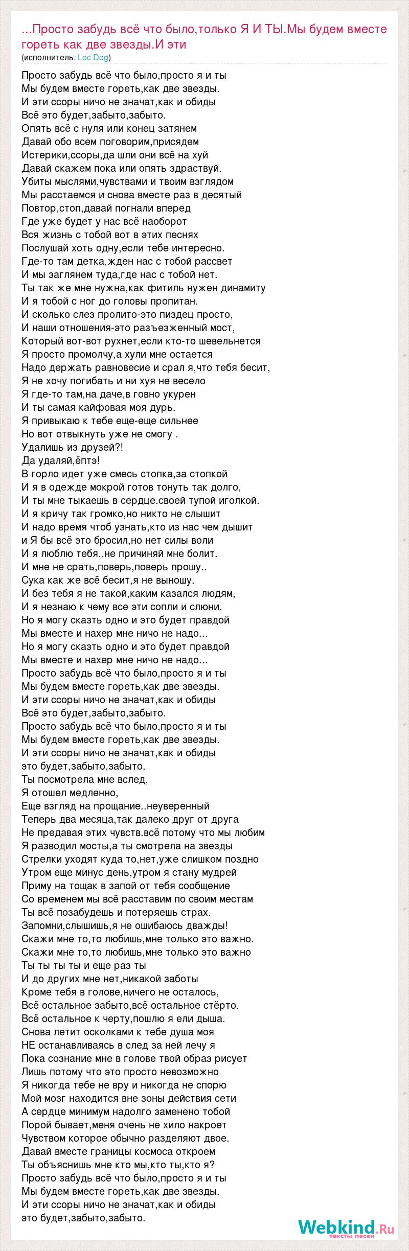 Просто забудь всё что было,просто я и ты Мы будем вместе гореть,как две звезды. И эти ссоры ничо не значат,как и обиды Всё это будет,забыто,забыто. Опять всё с нуля или конец затянем Давай обо всем поговорим,присядем Истерики,ссоры,да шли они всё на хуй Давай скажем пока или опять здраствуй. Убиты мыслями,чувствами и твоим взглядом Мы расстаемся и снова вместе раз в десятый Повтор,стоп,давай погнали вперед Где уже будет у нас всё наоборот Вся жизнь с тобой вот в этих песнях Послушай хоть одну,если тебе интересно. Где-то там детка,жден нас с тобой рассвет И мы заглянем туда,где нас с тобой нет. Ты так же мне нужна,как фитиль нужен динамиту И я тобой с ног до головы пропитан. И сколько слез пролито-это пиздец просто, И наши отношения-это разъезженный мост, Который вот-вот рухнет,если кто-то шевельнется Я просто промолчу,а хули мне остается Надо держать равновесие и срал я,что тебя бесит, Я не хочу погибать и ни хуя не весело Я где-то там,на даче,в говно укурен И ты самая кайфовая моя дурь. Я привыкаю к тебе еще-еще сильнее Но вот отвыкнуть уже не смогу . Удалишь из друзей?! Да удаляй,ёптэ! В горло идет уже смесь стопка,за стопкой И я в одежде мокрой готов тонуть так долго, И ты мне тыкаешь в сердце.своей тупой иголкой. И я кричу так громко,но никто не слышит И надо время чтоб узнать,кто из нас чем дышит и Я бы всё это бросил,но нет силы воли И я люблю тебя..не причиняй мне болит. И мне не срать,поверь,поверь прошу.. Сука как же всё бесит,я не выношу. И без тебя я не такой,каким казался людям, И я незнаю к чему все эти сопли и слюни. Но я могу сказть одно и это будет правдой Мы вместе и нахер мне ничо не надо... Но я могу сказть одно и это будет правдой Мы вместе и нахер мне ничо не надо... Просто забудь всё что было,просто я и ты Мы будем вместе гореть,как две звезды. И эти ссоры ничо не значат,как и обиды Всё это будет,забыто,забыто. Просто забудь всё что было,просто я и ты Мы будем вместе гореть,как две звезды. И эти ссоры ничо не значат,как и обиды это будет,забыто,забыто. Ты посмотрела мне вслед, Я отошел медленно, Еще взгляд на прощание..неуверенный Теперь два месяца,так далеко друг от друга Не предавая этих чувств.всё потому что мы любим Я разводил мосты,а ты смотрела на звезды Стрелки уходят куда то,нет,уже слишком поздно Утром еще минус день,утром я стану мудрей Приму на тощак в запой от тебя сообщение Со временем мы всё расставим по своим местам Ты всё позабудешь и потеряешь страх. Запомни,слышишь,я не ошибаюсь дважды! Скажи мне то,то любишь,мне только это важно. Скажи мне то,то любишь,мне только это важно Ты ты ты ты и еще раз ты И до других мне нет,никакой заботы Кроме тебя в голове,ничего не осталось, Всё остальное забыто,всё остальное стёрто. Всё остальное к черту,пошлю я ели дыша. Снова летит осколками к тебе душа моя НЕ останавливаясь в след за ней лечу я Пока сознание мне в голове твой образ рисует Лишь потому что это просто невозможно Я никогда тебе не вру и никогда не спорю Мой мозг находится вне зоны действия сети А сердце минимум надолго заменено тобой Порой бывает,меня очень не хило накроет Чувством которое обычно разделяют двое. Давай вместе границы космоса откроем Ты объяснишь мне кто мы,кто ты,кто я? Просто забудь всё что было,просто я и ты Мы будем вместе гореть,как две звезды. И эти ссоры ничо не значат,как и обиды это будет,забыто,забыто.