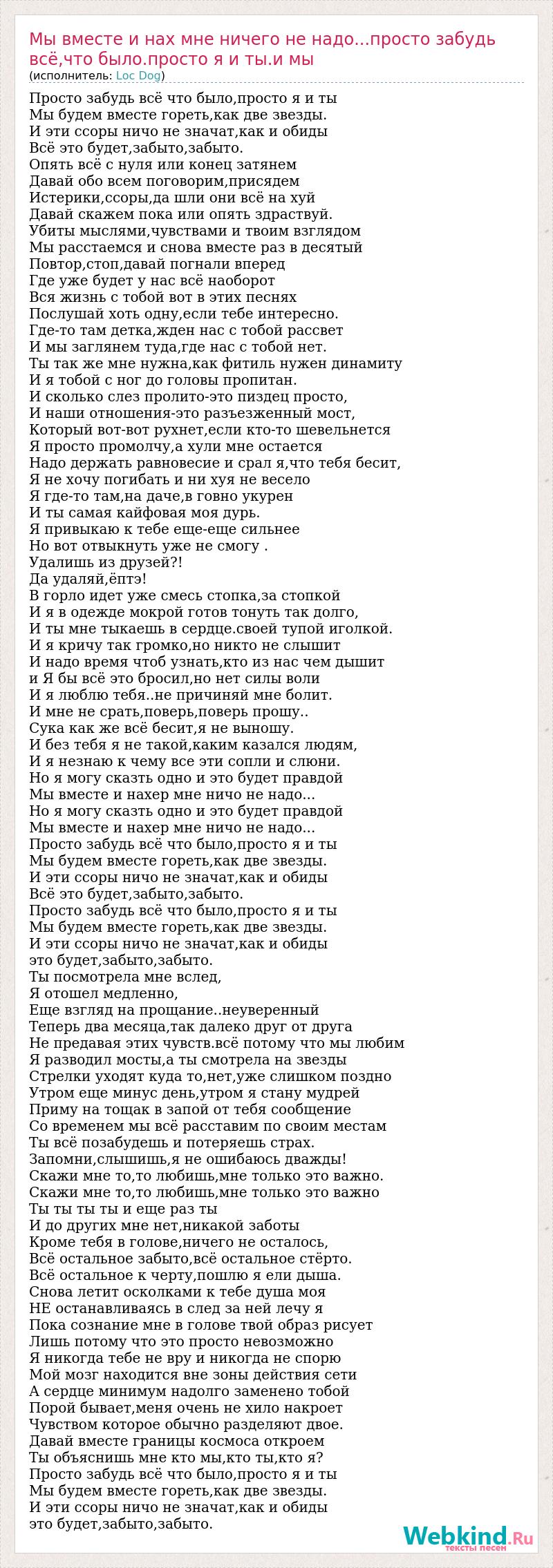 Просто забудь всё что было,просто я и ты Мы будем вместе гореть,как две звезды. И эти ссоры ничо не значат,как и обиды Всё это будет,забыто,забыто. Опять всё с нуля или конец затянем Давай обо всем поговорим,присядем Истерики,ссоры,да шли они всё на хуй Давай скажем пока или опять здраствуй. Убиты мыслями,чувствами и твоим взглядом Мы расстаемся и снова вместе раз в десятый Повтор,стоп,давай погнали вперед Где уже будет у нас всё наоборот Вся жизнь с тобой вот в этих песнях Послушай хоть одну,если тебе интересно. Где-то там детка,жден нас с тобой рассвет И мы заглянем туда,где нас с тобой нет. Ты так же мне нужна,как фитиль нужен динамиту И я тобой с ног до головы пропитан. И сколько слез пролито-это пиздец просто, И наши отношения-это разъезженный мост, Который вот-вот рухнет,если кто-то шевельнется Я просто промолчу,а хули мне остается Надо держать равновесие и срал я,что тебя бесит, Я не хочу погибать и ни хуя не весело Я где-то там,на даче,в говно укурен И ты самая кайфовая моя дурь. Я привыкаю к тебе еще-еще сильнее Но вот отвыкнуть уже не смогу . Удалишь из друзей?! Да удаляй,ёптэ! В горло идет уже смесь стопка,за стопкой И я в одежде мокрой готов тонуть так долго, И ты мне тыкаешь в сердце.своей тупой иголкой. И я кричу так громко,но никто не слышит И надо время чтоб узнать,кто из нас чем дышит и Я бы всё это бросил,но нет силы воли И я люблю тебя..не причиняй мне болит. И мне не срать,поверь,поверь прошу.. Сука как же всё бесит,я не выношу. И без тебя я не такой,каким казался людям, И я незнаю к чему все эти сопли и слюни. Но я могу сказть одно и это будет правдой Мы вместе и нахер мне ничо не надо... Но я могу сказть одно и это будет правдой Мы вместе и нахер мне ничо не надо... Просто забудь всё что было,просто я и ты Мы будем вместе гореть,как две звезды. И эти ссоры ничо не значат,как и обиды Всё это будет,забыто,забыто. Просто забудь всё что было,просто я и ты Мы будем вместе гореть,как две звезды. И эти ссоры ничо не значат,как и обиды это будет,забыто,забыто. Ты посмотрела мне вслед, Я отошел медленно, Еще взгляд на прощание..неуверенный Теперь два месяца,так далеко друг от друга Не предавая этих чувств.всё потому что мы любим Я разводил мосты,а ты смотрела на звезды Стрелки уходят куда то,нет,уже слишком поздно Утром еще минус день,утром я стану мудрей Приму на тощак в запой от тебя сообщение Со временем мы всё расставим по своим местам Ты всё позабудешь и потеряешь страх. Запомни,слышишь,я не ошибаюсь дважды! Скажи мне то,то любишь,мне только это важно. Скажи мне то,то любишь,мне только это важно Ты ты ты ты и еще раз ты И до других мне нет,никакой заботы Кроме тебя в голове,ничего не осталось, Всё остальное забыто,всё остальное стёрто. Всё остальное к черту,пошлю я ели дыша. Снова летит осколками к тебе душа моя НЕ останавливаясь в след за ней лечу я Пока сознание мне в голове твой образ рисует Лишь потому что это просто невозможно Я никогда тебе не вру и никогда не спорю Мой мозг находится вне зоны действия сети А сердце минимум надолго заменено тобой Порой бывает,меня очень не хило накроет Чувством которое обычно разделяют двое. Давай вместе границы космоса откроем Ты объяснишь мне кто мы,кто ты,кто я? Просто забудь всё что было,просто я и ты Мы будем вместе гореть,как две звезды. И эти ссоры ничо не значат,как и обиды это будет,забыто,забыто.