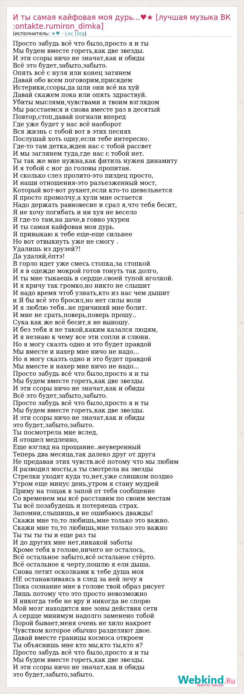 Просто забудь всё что было,просто я и ты Мы будем вместе гореть,как две звезды. И эти ссоры ничо не значат,как и обиды Всё это будет,забыто,забыто. Опять всё с нуля или конец затянем Давай обо всем поговорим,присядем Истерики,ссоры,да шли они всё на хуй Давай скажем пока или опять здраствуй. Убиты мыслями,чувствами и твоим взглядом Мы расстаемся и снова вместе раз в десятый Повтор,стоп,давай погнали вперед Где уже будет у нас всё наоборот Вся жизнь с тобой вот в этих песнях Послушай хоть одну,если тебе интересно. Где-то там детка,жден нас с тобой рассвет И мы заглянем туда,где нас с тобой нет. Ты так же мне нужна,как фитиль нужен динамиту И я тобой с ног до головы пропитан. И сколько слез пролито-это пиздец просто, И наши отношения-это разъезженный мост, Который вот-вот рухнет,если кто-то шевельнется Я просто промолчу,а хули мне остается Надо держать равновесие и срал я,что тебя бесит, Я не хочу погибать и ни хуя не весело Я где-то там,на даче,в говно укурен И ты самая кайфовая моя дурь. Я привыкаю к тебе еще-еще сильнее Но вот отвыкнуть уже не смогу . Удалишь из друзей?! Да удаляй,ёптэ! В горло идет уже смесь стопка,за стопкой И я в одежде мокрой готов тонуть так долго, И ты мне тыкаешь в сердце.своей тупой иголкой. И я кричу так громко,но никто не слышит И надо время чтоб узнать,кто из нас чем дышит и Я бы всё это бросил,но нет силы воли И я люблю тебя..не причиняй мне болит. И мне не срать,поверь,поверь прошу.. Сука как же всё бесит,я не выношу. И без тебя я не такой,каким казался людям, И я незнаю к чему все эти сопли и слюни. Но я могу сказть одно и это будет правдой Мы вместе и нахер мне ничо не надо... Но я могу сказть одно и это будет правдой Мы вместе и нахер мне ничо не надо... Просто забудь всё что было,просто я и ты Мы будем вместе гореть,как две звезды. И эти ссоры ничо не значат,как и обиды Всё это будет,забыто,забыто. Просто забудь всё что было,просто я и ты Мы будем вместе гореть,как две звезды. И эти ссоры ничо не значат,как и обиды это будет,забыто,забыто. Ты посмотрела мне вслед, Я отошел медленно, Еще взгляд на прощание..неуверенный Теперь два месяца,так далеко друг от друга Не предавая этих чувств.всё потому что мы любим Я разводил мосты,а ты смотрела на звезды Стрелки уходят куда то,нет,уже слишком поздно Утром еще минус день,утром я стану мудрей Приму на тощак в запой от тебя сообщение Со временем мы всё расставим по своим местам Ты всё позабудешь и потеряешь страх. Запомни,слышишь,я не ошибаюсь дважды! Скажи мне то,то любишь,мне только это важно. Скажи мне то,то любишь,мне только это важно Ты ты ты ты и еще раз ты И до других мне нет,никакой заботы Кроме тебя в голове,ничего не осталось, Всё остальное забыто,всё остальное стёрто. Всё остальное к черту,пошлю я ели дыша. Снова летит осколками к тебе душа моя НЕ останавливаясь в след за ней лечу я Пока сознание мне в голове твой образ рисует Лишь потому что это просто невозможно Я никогда тебе не вру и никогда не спорю Мой мозг находится вне зоны действия сети А сердце минимум надолго заменено тобой Порой бывает,меня очень не хило накроет Чувством которое обычно разделяют двое. Давай вместе границы космоса откроем Ты объяснишь мне кто мы,кто ты,кто я? Просто забудь всё что было,просто я и ты Мы будем вместе гореть,как две звезды. И эти ссоры ничо не значат,как и обиды это будет,забыто,забыто.