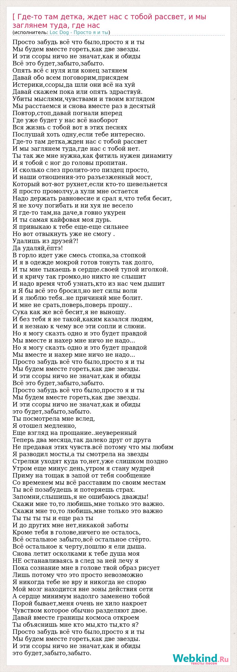 Просто забудь всё что было,просто я и ты Мы будем вместе гореть,как две звезды. И эти ссоры ничо не значат,как и обиды Всё это будет,забыто,забыто. Опять всё с нуля или конец затянем Давай обо всем поговорим,присядем Истерики,ссоры,да шли они всё на хуй Давай скажем пока или опять здраствуй. Убиты мыслями,чувствами и твоим взглядом Мы расстаемся и снова вместе раз в десятый Повтор,стоп,давай погнали вперед Где уже будет у нас всё наоборот Вся жизнь с тобой вот в этих песнях Послушай хоть одну,если тебе интересно. Где-то там детка,жден нас с тобой рассвет И мы заглянем туда,где нас с тобой нет. Ты так же мне нужна,как фитиль нужен динамиту И я тобой с ног до головы пропитан. И сколько слез пролито-это пиздец просто, И наши отношения-это разъезженный мост, Который вот-вот рухнет,если кто-то шевельнется Я просто промолчу,а хули мне остается Надо держать равновесие и срал я,что тебя бесит, Я не хочу погибать и ни хуя не весело Я где-то там,на даче,в говно укурен И ты самая кайфовая моя дурь. Я привыкаю к тебе еще-еще сильнее Но вот отвыкнуть уже не смогу . Удалишь из друзей?! Да удаляй,ёптэ! В горло идет уже смесь стопка,за стопкой И я в одежде мокрой готов тонуть так долго, И ты мне тыкаешь в сердце.своей тупой иголкой. И я кричу так громко,но никто не слышит И надо время чтоб узнать,кто из нас чем дышит и Я бы всё это бросил,но нет силы воли И я люблю тебя..не причиняй мне болит. И мне не срать,поверь,поверь прошу.. Сука как же всё бесит,я не выношу. И без тебя я не такой,каким казался людям, И я незнаю к чему все эти сопли и слюни. Но я могу сказть одно и это будет правдой Мы вместе и нахер мне ничо не надо... Но я могу сказть одно и это будет правдой Мы вместе и нахер мне ничо не надо... Просто забудь всё что было,просто я и ты Мы будем вместе гореть,как две звезды. И эти ссоры ничо не значат,как и обиды Всё это будет,забыто,забыто. Просто забудь всё что было,просто я и ты Мы будем вместе гореть,как две звезды. И эти ссоры ничо не значат,как и обиды это будет,забыто,забыто. Ты посмотрела мне вслед, Я отошел медленно, Еще взгляд на прощание..неуверенный Теперь два месяца,так далеко друг от друга Не предавая этих чувств.всё потому что мы любим Я разводил мосты,а ты смотрела на звезды Стрелки уходят куда то,нет,уже слишком поздно Утром еще минус день,утром я стану мудрей Приму на тощак в запой от тебя сообщение Со временем мы всё расставим по своим местам Ты всё позабудешь и потеряешь страх. Запомни,слышишь,я не ошибаюсь дважды! Скажи мне то,то любишь,мне только это важно. Скажи мне то,то любишь,мне только это важно Ты ты ты ты и еще раз ты И до других мне нет,никакой заботы Кроме тебя в голове,ничего не осталось, Всё остальное забыто,всё остальное стёрто. Всё остальное к черту,пошлю я ели дыша. Снова летит осколками к тебе душа моя НЕ останавливаясь в след за ней лечу я Пока сознание мне в голове твой образ рисует Лишь потому что это просто невозможно Я никогда тебе не вру и никогда не спорю Мой мозг находится вне зоны действия сети А сердце минимум надолго заменено тобой Порой бывает,меня очень не хило накроет Чувством которое обычно разделяют двое. Давай вместе границы космоса откроем Ты объяснишь мне кто мы,кто ты,кто я? Просто забудь всё что было,просто я и ты Мы будем вместе гореть,как две звезды. И эти ссоры ничо не значат,как и обиды это будет,забыто,забыто.