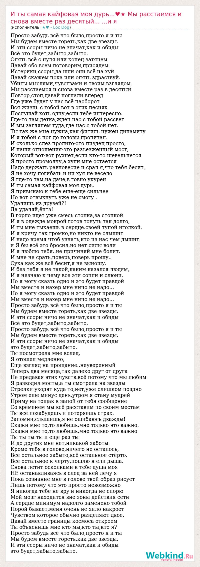 Просто забудь всё что было,просто я и ты Мы будем вместе гореть,как две звезды. И эти ссоры ничо не значат,как и обиды Всё это будет,забыто,забыто. Опять всё с нуля или конец затянем Давай обо всем поговорим,присядем Истерики,ссоры,да шли они всё на хуй Давай скажем пока или опять здраствуй. Убиты мыслями,чувствами и твоим взглядом Мы расстаемся и снова вместе раз в десятый Повтор,стоп,давай погнали вперед Где уже будет у нас всё наоборот Вся жизнь с тобой вот в этих песнях Послушай хоть одну,если тебе интересно. Где-то там детка,жден нас с тобой рассвет И мы заглянем туда,где нас с тобой нет. Ты так же мне нужна,как фитиль нужен динамиту И я тобой с ног до головы пропитан. И сколько слез пролито-это пиздец просто, И наши отношения-это разъезженный мост, Который вот-вот рухнет,если кто-то шевельнется Я просто промолчу,а хули мне остается Надо держать равновесие и срал я,что тебя бесит, Я не хочу погибать и ни хуя не весело Я где-то там,на даче,в говно укурен И ты самая кайфовая моя дурь. Я привыкаю к тебе еще-еще сильнее Но вот отвыкнуть уже не смогу . Удалишь из друзей?! Да удаляй,ёптэ! В горло идет уже смесь стопка,за стопкой И я в одежде мокрой готов тонуть так долго, И ты мне тыкаешь в сердце.своей тупой иголкой. И я кричу так громко,но никто не слышит И надо время чтоб узнать,кто из нас чем дышит и Я бы всё это бросил,но нет силы воли И я люблю тебя..не причиняй мне болит. И мне не срать,поверь,поверь прошу.. Сука как же всё бесит,я не выношу. И без тебя я не такой,каким казался людям, И я незнаю к чему все эти сопли и слюни. Но я могу сказть одно и это будет правдой Мы вместе и нахер мне ничо не надо... Но я могу сказть одно и это будет правдой Мы вместе и нахер мне ничо не надо... Просто забудь всё что было,просто я и ты Мы будем вместе гореть,как две звезды. И эти ссоры ничо не значат,как и обиды Всё это будет,забыто,забыто. Просто забудь всё что было,просто я и ты Мы будем вместе гореть,как две звезды. И эти ссоры ничо не значат,как и обиды это будет,забыто,забыто. Ты посмотрела мне вслед, Я отошел медленно, Еще взгляд на прощание..неуверенный Теперь два месяца,так далеко друг от друга Не предавая этих чувств.всё потому что мы любим Я разводил мосты,а ты смотрела на звезды Стрелки уходят куда то,нет,уже слишком поздно Утром еще минус день,утром я стану мудрей Приму на тощак в запой от тебя сообщение Со временем мы всё расставим по своим местам Ты всё позабудешь и потеряешь страх. Запомни,слышишь,я не ошибаюсь дважды! Скажи мне то,то любишь,мне только это важно. Скажи мне то,то любишь,мне только это важно Ты ты ты ты и еще раз ты И до других мне нет,никакой заботы Кроме тебя в голове,ничего не осталось, Всё остальное забыто,всё остальное стёрто. Всё остальное к черту,пошлю я ели дыша. Снова летит осколками к тебе душа моя НЕ останавливаясь в след за ней лечу я Пока сознание мне в голове твой образ рисует Лишь потому что это просто невозможно Я никогда тебе не вру и никогда не спорю Мой мозг находится вне зоны действия сети А сердце минимум надолго заменено тобой Порой бывает,меня очень не хило накроет Чувством которое обычно разделяют двое. Давай вместе границы космоса откроем Ты объяснишь мне кто мы,кто ты,кто я? Просто забудь всё что было,просто я и ты Мы будем вместе гореть,как две звезды. И эти ссоры ничо не значат,как и обиды это будет,забыто,забыто.