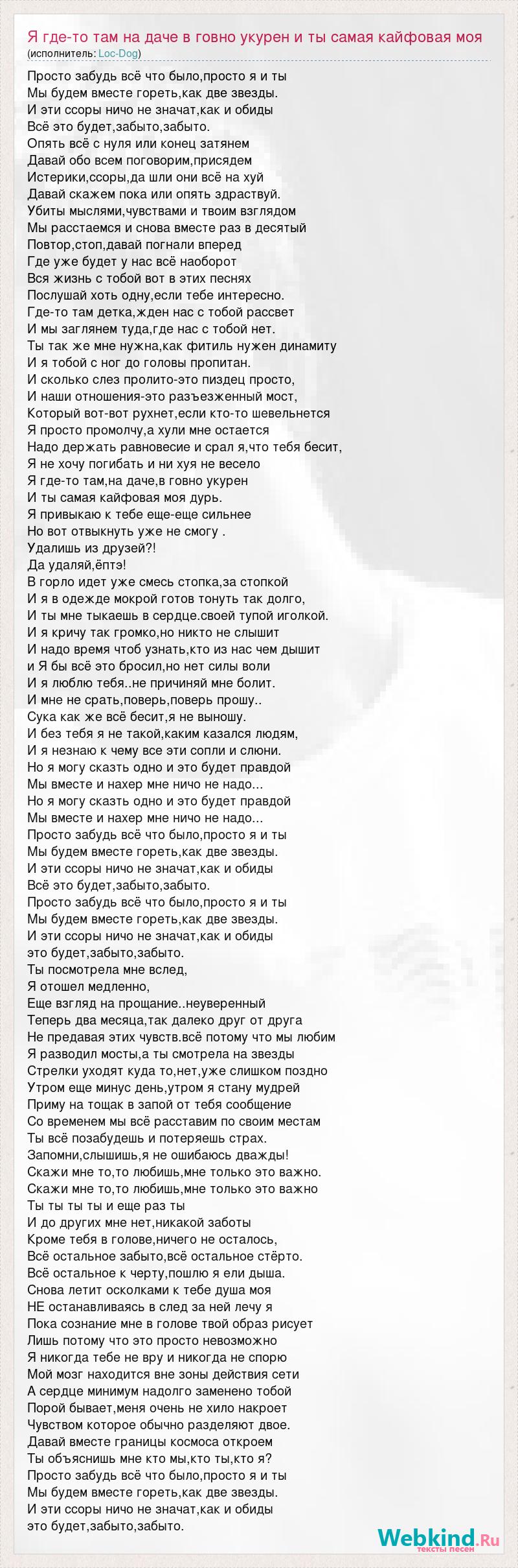 Просто забудь всё что было,просто я и ты Мы будем вместе гореть,как две звезды. И эти ссоры ничо не значат,как и обиды Всё это будет,забыто,забыто. Опять всё с нуля или конец затянем Давай обо всем поговорим,присядем Истерики,ссоры,да шли они всё на хуй Давай скажем пока или опять здраствуй. Убиты мыслями,чувствами и твоим взглядом Мы расстаемся и снова вместе раз в десятый Повтор,стоп,давай погнали вперед Где уже будет у нас всё наоборот Вся жизнь с тобой вот в этих песнях Послушай хоть одну,если тебе интересно. Где-то там детка,жден нас с тобой рассвет И мы заглянем туда,где нас с тобой нет. Ты так же мне нужна,как фитиль нужен динамиту И я тобой с ног до головы пропитан. И сколько слез пролито-это пиздец просто, И наши отношения-это разъезженный мост, Который вот-вот рухнет,если кто-то шевельнется Я просто промолчу,а хули мне остается Надо держать равновесие и срал я,что тебя бесит, Я не хочу погибать и ни хуя не весело Я где-то там,на даче,в говно укурен И ты самая кайфовая моя дурь. Я привыкаю к тебе еще-еще сильнее Но вот отвыкнуть уже не смогу . Удалишь из друзей?! Да удаляй,ёптэ! В горло идет уже смесь стопка,за стопкой И я в одежде мокрой готов тонуть так долго, И ты мне тыкаешь в сердце.своей тупой иголкой. И я кричу так громко,но никто не слышит И надо время чтоб узнать,кто из нас чем дышит и Я бы всё это бросил,но нет силы воли И я люблю тебя..не причиняй мне болит. И мне не срать,поверь,поверь прошу.. Сука как же всё бесит,я не выношу. И без тебя я не такой,каким казался людям, И я незнаю к чему все эти сопли и слюни. Но я могу сказть одно и это будет правдой Мы вместе и нахер мне ничо не надо... Но я могу сказть одно и это будет правдой Мы вместе и нахер мне ничо не надо... Просто забудь всё что было,просто я и ты Мы будем вместе гореть,как две звезды. И эти ссоры ничо не значат,как и обиды Всё это будет,забыто,забыто. Просто забудь всё что было,просто я и ты Мы будем вместе гореть,как две звезды. И эти ссоры ничо не значат,как и обиды это будет,забыто,забыто. Ты посмотрела мне вслед, Я отошел медленно, Еще взгляд на прощание..неуверенный Теперь два месяца,так далеко друг от друга Не предавая этих чувств.всё потому что мы любим Я разводил мосты,а ты смотрела на звезды Стрелки уходят куда то,нет,уже слишком поздно Утром еще минус день,утром я стану мудрей Приму на тощак в запой от тебя сообщение Со временем мы всё расставим по своим местам Ты всё позабудешь и потеряешь страх. Запомни,слышишь,я не ошибаюсь дважды! Скажи мне то,то любишь,мне только это важно. Скажи мне то,то любишь,мне только это важно Ты ты ты ты и еще раз ты И до других мне нет,никакой заботы Кроме тебя в голове,ничего не осталось, Всё остальное забыто,всё остальное стёрто. Всё остальное к черту,пошлю я ели дыша. Снова летит осколками к тебе душа моя НЕ останавливаясь в след за ней лечу я Пока сознание мне в голове твой образ рисует Лишь потому что это просто невозможно Я никогда тебе не вру и никогда не спорю Мой мозг находится вне зоны действия сети А сердце минимум надолго заменено тобой Порой бывает,меня очень не хило накроет Чувством которое обычно разделяют двое. Давай вместе границы космоса откроем Ты объяснишь мне кто мы,кто ты,кто я? Просто забудь всё что было,просто я и ты Мы будем вместе гореть,как две звезды. И эти ссоры ничо не значат,как и обиды это будет,забыто,забыто.