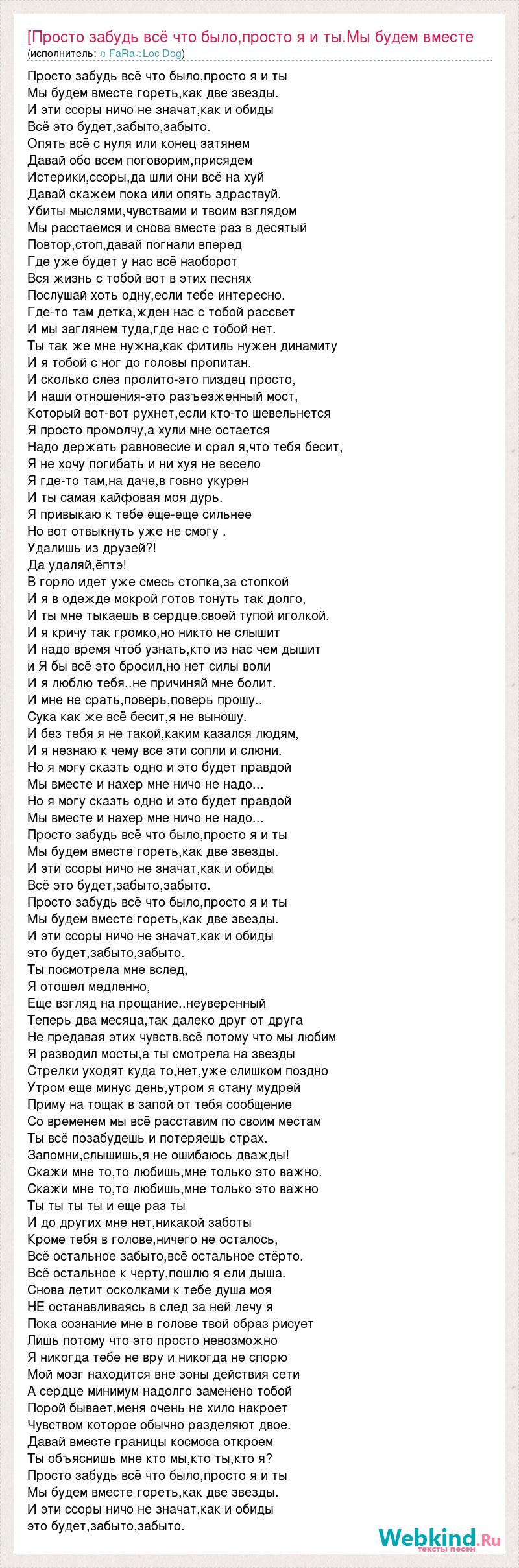 Просто забудь всё что было,просто я и ты Мы будем вместе гореть,как две звезды. И эти ссоры ничо не значат,как и обиды Всё это будет,забыто,забыто. Опять всё с нуля или конец затянем Давай обо всем поговорим,присядем Истерики,ссоры,да шли они всё на хуй Давай скажем пока или опять здраствуй. Убиты мыслями,чувствами и твоим взглядом Мы расстаемся и снова вместе раз в десятый Повтор,стоп,давай погнали вперед Где уже будет у нас всё наоборот Вся жизнь с тобой вот в этих песнях Послушай хоть одну,если тебе интересно. Где-то там детка,жден нас с тобой рассвет И мы заглянем туда,где нас с тобой нет. Ты так же мне нужна,как фитиль нужен динамиту И я тобой с ног до головы пропитан. И сколько слез пролито-это пиздец просто, И наши отношения-это разъезженный мост, Который вот-вот рухнет,если кто-то шевельнется Я просто промолчу,а хули мне остается Надо держать равновесие и срал я,что тебя бесит, Я не хочу погибать и ни хуя не весело Я где-то там,на даче,в говно укурен И ты самая кайфовая моя дурь. Я привыкаю к тебе еще-еще сильнее Но вот отвыкнуть уже не смогу . Удалишь из друзей?! Да удаляй,ёптэ! В горло идет уже смесь стопка,за стопкой И я в одежде мокрой готов тонуть так долго, И ты мне тыкаешь в сердце.своей тупой иголкой. И я кричу так громко,но никто не слышит И надо время чтоб узнать,кто из нас чем дышит и Я бы всё это бросил,но нет силы воли И я люблю тебя..не причиняй мне болит. И мне не срать,поверь,поверь прошу.. Сука как же всё бесит,я не выношу. И без тебя я не такой,каким казался людям, И я незнаю к чему все эти сопли и слюни. Но я могу сказть одно и это будет правдой Мы вместе и нахер мне ничо не надо... Но я могу сказть одно и это будет правдой Мы вместе и нахер мне ничо не надо... Просто забудь всё что было,просто я и ты Мы будем вместе гореть,как две звезды. И эти ссоры ничо не значат,как и обиды Всё это будет,забыто,забыто. Просто забудь всё что было,просто я и ты Мы будем вместе гореть,как две звезды. И эти ссоры ничо не значат,как и обиды это будет,забыто,забыто. Ты посмотрела мне вслед, Я отошел медленно, Еще взгляд на прощание..неуверенный Теперь два месяца,так далеко друг от друга Не предавая этих чувств.всё потому что мы любим Я разводил мосты,а ты смотрела на звезды Стрелки уходят куда то,нет,уже слишком поздно Утром еще минус день,утром я стану мудрей Приму на тощак в запой от тебя сообщение Со временем мы всё расставим по своим местам Ты всё позабудешь и потеряешь страх. Запомни,слышишь,я не ошибаюсь дважды! Скажи мне то,то любишь,мне только это важно. Скажи мне то,то любишь,мне только это важно Ты ты ты ты и еще раз ты И до других мне нет,никакой заботы Кроме тебя в голове,ничего не осталось, Всё остальное забыто,всё остальное стёрто. Всё остальное к черту,пошлю я ели дыша. Снова летит осколками к тебе душа моя НЕ останавливаясь в след за ней лечу я Пока сознание мне в голове твой образ рисует Лишь потому что это просто невозможно Я никогда тебе не вру и никогда не спорю Мой мозг находится вне зоны действия сети А сердце минимум надолго заменено тобой Порой бывает,меня очень не хило накроет Чувством которое обычно разделяют двое. Давай вместе границы космоса откроем Ты объяснишь мне кто мы,кто ты,кто я? Просто забудь всё что было,просто я и ты Мы будем вместе гореть,как две звезды. И эти ссоры ничо не значат,как и обиды это будет,забыто,забыто.