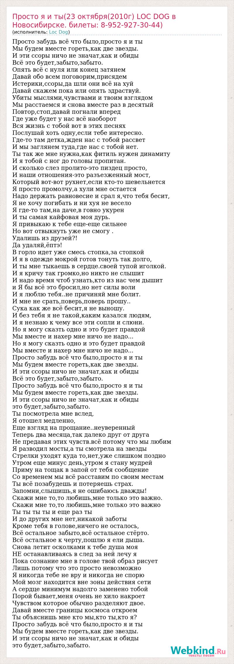 Просто забудь всё что было,просто я и ты Мы будем вместе гореть,как две звезды. И эти ссоры ничо не значат,как и обиды Всё это будет,забыто,забыто. Опять всё с нуля или конец затянем Давай обо всем поговорим,присядем Истерики,ссоры,да шли они всё на хуй Давай скажем пока или опять здраствуй. Убиты мыслями,чувствами и твоим взглядом Мы расстаемся и снова вместе раз в десятый Повтор,стоп,давай погнали вперед Где уже будет у нас всё наоборот Вся жизнь с тобой вот в этих песнях Послушай хоть одну,если тебе интересно. Где-то там детка,жден нас с тобой рассвет И мы заглянем туда,где нас с тобой нет. Ты так же мне нужна,как фитиль нужен динамиту И я тобой с ног до головы пропитан. И сколько слез пролито-это пиздец просто, И наши отношения-это разъезженный мост, Который вот-вот рухнет,если кто-то шевельнется Я просто промолчу,а хули мне остается Надо держать равновесие и срал я,что тебя бесит, Я не хочу погибать и ни хуя не весело Я где-то там,на даче,в говно укурен И ты самая кайфовая моя дурь. Я привыкаю к тебе еще-еще сильнее Но вот отвыкнуть уже не смогу . Удалишь из друзей?! Да удаляй,ёптэ! В горло идет уже смесь стопка,за стопкой И я в одежде мокрой готов тонуть так долго, И ты мне тыкаешь в сердце.своей тупой иголкой. И я кричу так громко,но никто не слышит И надо время чтоб узнать,кто из нас чем дышит и Я бы всё это бросил,но нет силы воли И я люблю тебя..не причиняй мне болит. И мне не срать,поверь,поверь прошу.. Сука как же всё бесит,я не выношу. И без тебя я не такой,каким казался людям, И я незнаю к чему все эти сопли и слюни. Но я могу сказть одно и это будет правдой Мы вместе и нахер мне ничо не надо... Но я могу сказть одно и это будет правдой Мы вместе и нахер мне ничо не надо... Просто забудь всё что было,просто я и ты Мы будем вместе гореть,как две звезды. И эти ссоры ничо не значат,как и обиды Всё это будет,забыто,забыто. Просто забудь всё что было,просто я и ты Мы будем вместе гореть,как две звезды. И эти ссоры ничо не значат,как и обиды это будет,забыто,забыто. Ты посмотрела мне вслед, Я отошел медленно, Еще взгляд на прощание..неуверенный Теперь два месяца,так далеко друг от друга Не предавая этих чувств.всё потому что мы любим Я разводил мосты,а ты смотрела на звезды Стрелки уходят куда то,нет,уже слишком поздно Утром еще минус день,утром я стану мудрей Приму на тощак в запой от тебя сообщение Со временем мы всё расставим по своим местам Ты всё позабудешь и потеряешь страх. Запомни,слышишь,я не ошибаюсь дважды! Скажи мне то,то любишь,мне только это важно. Скажи мне то,то любишь,мне только это важно Ты ты ты ты и еще раз ты И до других мне нет,никакой заботы Кроме тебя в голове,ничего не осталось, Всё остальное забыто,всё остальное стёрто. Всё остальное к черту,пошлю я ели дыша. Снова летит осколками к тебе душа моя НЕ останавливаясь в след за ней лечу я Пока сознание мне в голове твой образ рисует Лишь потому что это просто невозможно Я никогда тебе не вру и никогда не спорю Мой мозг находится вне зоны действия сети А сердце минимум надолго заменено тобой Порой бывает,меня очень не хило накроет Чувством которое обычно разделяют двое. Давай вместе границы космоса откроем Ты объяснишь мне кто мы,кто ты,кто я? Просто забудь всё что было,просто я и ты Мы будем вместе гореть,как две звезды. И эти ссоры ничо не значат,как и обиды это будет,забыто,забыто.