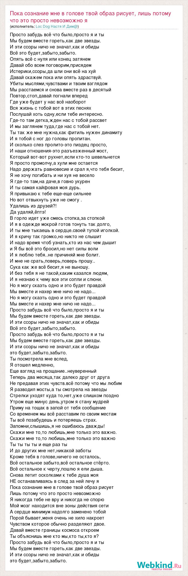 Просто забудь всё что было,просто я и ты Мы будем вместе гореть,как две звезды. И эти ссоры ничо не значат,как и обиды Всё это будет,забыто,забыто. Опять всё с нуля или конец затянем Давай обо всем поговорим,присядем Истерики,ссоры,да шли они всё на хуй Давай скажем пока или опять здраствуй. Убиты мыслями,чувствами и твоим взглядом Мы расстаемся и снова вместе раз в десятый Повтор,стоп,давай погнали вперед Где уже будет у нас всё наоборот Вся жизнь с тобой вот в этих песнях Послушай хоть одну,если тебе интересно. Где-то там детка,жден нас с тобой рассвет И мы заглянем туда,где нас с тобой нет. Ты так же мне нужна,как фитиль нужен динамиту И я тобой с ног до головы пропитан. И сколько слез пролито-это пиздец просто, И наши отношения-это разъезженный мост, Который вот-вот рухнет,если кто-то шевельнется Я просто промолчу,а хули мне остается Надо держать равновесие и срал я,что тебя бесит, Я не хочу погибать и ни хуя не весело Я где-то там,на даче,в говно укурен И ты самая кайфовая моя дурь. Я привыкаю к тебе еще-еще сильнее Но вот отвыкнуть уже не смогу . Удалишь из друзей?! Да удаляй,ёптэ! В горло идет уже смесь стопка,за стопкой И я в одежде мокрой готов тонуть так долго, И ты мне тыкаешь в сердце.своей тупой иголкой. И я кричу так громко,но никто не слышит И надо время чтоб узнать,кто из нас чем дышит и Я бы всё это бросил,но нет силы воли И я люблю тебя..не причиняй мне болит. И мне не срать,поверь,поверь прошу.. Сука как же всё бесит,я не выношу. И без тебя я не такой,каким казался людям, И я незнаю к чему все эти сопли и слюни. Но я могу сказть одно и это будет правдой Мы вместе и нахер мне ничо не надо... Но я могу сказть одно и это будет правдой Мы вместе и нахер мне ничо не надо... Просто забудь всё что было,просто я и ты Мы будем вместе гореть,как две звезды. И эти ссоры ничо не значат,как и обиды Всё это будет,забыто,забыто. Просто забудь всё что было,просто я и ты Мы будем вместе гореть,как две звезды. И эти ссоры ничо не значат,как и обиды это будет,забыто,забыто. Ты посмотрела мне вслед, Я отошел медленно, Еще взгляд на прощание..неуверенный Теперь два месяца,так далеко друг от друга Не предавая этих чувств.всё потому что мы любим Я разводил мосты,а ты смотрела на звезды Стрелки уходят куда то,нет,уже слишком поздно Утром еще минус день,утром я стану мудрей Приму на тощак в запой от тебя сообщение Со временем мы всё расставим по своим местам Ты всё позабудешь и потеряешь страх. Запомни,слышишь,я не ошибаюсь дважды! Скажи мне то,то любишь,мне только это важно. Скажи мне то,то любишь,мне только это важно Ты ты ты ты и еще раз ты И до других мне нет,никакой заботы Кроме тебя в голове,ничего не осталось, Всё остальное забыто,всё остальное стёрто. Всё остальное к черту,пошлю я ели дыша. Снова летит осколками к тебе душа моя НЕ останавливаясь в след за ней лечу я Пока сознание мне в голове твой образ рисует Лишь потому что это просто невозможно Я никогда тебе не вру и никогда не спорю Мой мозг находится вне зоны действия сети А сердце минимум надолго заменено тобой Порой бывает,меня очень не хило накроет Чувством которое обычно разделяют двое. Давай вместе границы космоса откроем Ты объяснишь мне кто мы,кто ты,кто я? Просто забудь всё что было,просто я и ты Мы будем вместе гореть,как две звезды. И эти ссоры ничо не значат,как и обиды это будет,забыто,забыто.