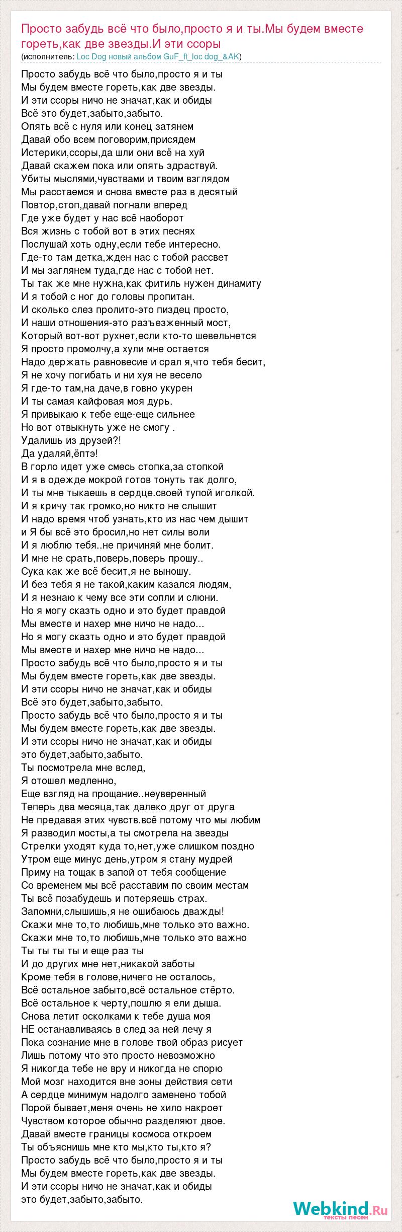Просто забудь всё что было,просто я и ты Мы будем вместе гореть,как две звезды. И эти ссоры ничо не значат,как и обиды Всё это будет,забыто,забыто. Опять всё с нуля или конец затянем Давай обо всем поговорим,присядем Истерики,ссоры,да шли они всё на хуй Давай скажем пока или опять здраствуй. Убиты мыслями,чувствами и твоим взглядом Мы расстаемся и снова вместе раз в десятый Повтор,стоп,давай погнали вперед Где уже будет у нас всё наоборот Вся жизнь с тобой вот в этих песнях Послушай хоть одну,если тебе интересно. Где-то там детка,жден нас с тобой рассвет И мы заглянем туда,где нас с тобой нет. Ты так же мне нужна,как фитиль нужен динамиту И я тобой с ног до головы пропитан. И сколько слез пролито-это пиздец просто, И наши отношения-это разъезженный мост, Который вот-вот рухнет,если кто-то шевельнется Я просто промолчу,а хули мне остается Надо держать равновесие и срал я,что тебя бесит, Я не хочу погибать и ни хуя не весело Я где-то там,на даче,в говно укурен И ты самая кайфовая моя дурь. Я привыкаю к тебе еще-еще сильнее Но вот отвыкнуть уже не смогу . Удалишь из друзей?! Да удаляй,ёптэ! В горло идет уже смесь стопка,за стопкой И я в одежде мокрой готов тонуть так долго, И ты мне тыкаешь в сердце.своей тупой иголкой. И я кричу так громко,но никто не слышит И надо время чтоб узнать,кто из нас чем дышит и Я бы всё это бросил,но нет силы воли И я люблю тебя..не причиняй мне болит. И мне не срать,поверь,поверь прошу.. Сука как же всё бесит,я не выношу. И без тебя я не такой,каким казался людям, И я незнаю к чему все эти сопли и слюни. Но я могу сказть одно и это будет правдой Мы вместе и нахер мне ничо не надо... Но я могу сказть одно и это будет правдой Мы вместе и нахер мне ничо не надо... Просто забудь всё что было,просто я и ты Мы будем вместе гореть,как две звезды. И эти ссоры ничо не значат,как и обиды Всё это будет,забыто,забыто. Просто забудь всё что было,просто я и ты Мы будем вместе гореть,как две звезды. И эти ссоры ничо не значат,как и обиды это будет,забыто,забыто. Ты посмотрела мне вслед, Я отошел медленно, Еще взгляд на прощание..неуверенный Теперь два месяца,так далеко друг от друга Не предавая этих чувств.всё потому что мы любим Я разводил мосты,а ты смотрела на звезды Стрелки уходят куда то,нет,уже слишком поздно Утром еще минус день,утром я стану мудрей Приму на тощак в запой от тебя сообщение Со временем мы всё расставим по своим местам Ты всё позабудешь и потеряешь страх. Запомни,слышишь,я не ошибаюсь дважды! Скажи мне то,то любишь,мне только это важно. Скажи мне то,то любишь,мне только это важно Ты ты ты ты и еще раз ты И до других мне нет,никакой заботы Кроме тебя в голове,ничего не осталось, Всё остальное забыто,всё остальное стёрто. Всё остальное к черту,пошлю я ели дыша. Снова летит осколками к тебе душа моя НЕ останавливаясь в след за ней лечу я Пока сознание мне в голове твой образ рисует Лишь потому что это просто невозможно Я никогда тебе не вру и никогда не спорю Мой мозг находится вне зоны действия сети А сердце минимум надолго заменено тобой Порой бывает,меня очень не хило накроет Чувством которое обычно разделяют двое. Давай вместе границы космоса откроем Ты объяснишь мне кто мы,кто ты,кто я? Просто забудь всё что было,просто я и ты Мы будем вместе гореть,как две звезды. И эти ссоры ничо не значат,как и обиды это будет,забыто,забыто.
