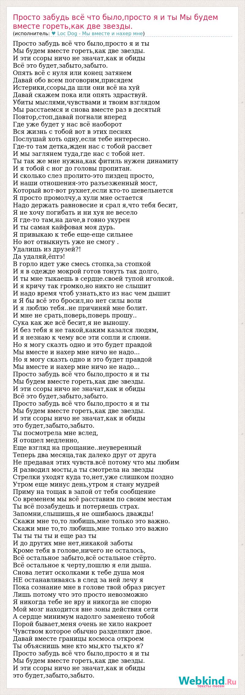 Просто забудь всё что было,просто я и ты Мы будем вместе гореть,как две звезды. И эти ссоры ничо не значат,как и обиды Всё это будет,забыто,забыто. Опять всё с нуля или конец затянем Давай обо всем поговорим,присядем Истерики,ссоры,да шли они всё на хуй Давай скажем пока или опять здраствуй. Убиты мыслями,чувствами и твоим взглядом Мы расстаемся и снова вместе раз в десятый Повтор,стоп,давай погнали вперед Где уже будет у нас всё наоборот Вся жизнь с тобой вот в этих песнях Послушай хоть одну,если тебе интересно. Где-то там детка,жден нас с тобой рассвет И мы заглянем туда,где нас с тобой нет. Ты так же мне нужна,как фитиль нужен динамиту И я тобой с ног до головы пропитан. И сколько слез пролито-это пиздец просто, И наши отношения-это разъезженный мост, Который вот-вот рухнет,если кто-то шевельнется Я просто промолчу,а хули мне остается Надо держать равновесие и срал я,что тебя бесит, Я не хочу погибать и ни хуя не весело Я где-то там,на даче,в говно укурен И ты самая кайфовая моя дурь. Я привыкаю к тебе еще-еще сильнее Но вот отвыкнуть уже не смогу . Удалишь из друзей?! Да удаляй,ёптэ! В горло идет уже смесь стопка,за стопкой И я в одежде мокрой готов тонуть так долго, И ты мне тыкаешь в сердце.своей тупой иголкой. И я кричу так громко,но никто не слышит И надо время чтоб узнать,кто из нас чем дышит и Я бы всё это бросил,но нет силы воли И я люблю тебя..не причиняй мне болит. И мне не срать,поверь,поверь прошу.. Сука как же всё бесит,я не выношу. И без тебя я не такой,каким казался людям, И я незнаю к чему все эти сопли и слюни. Но я могу сказть одно и это будет правдой Мы вместе и нахер мне ничо не надо... Но я могу сказть одно и это будет правдой Мы вместе и нахер мне ничо не надо... Просто забудь всё что было,просто я и ты Мы будем вместе гореть,как две звезды. И эти ссоры ничо не значат,как и обиды Всё это будет,забыто,забыто. Просто забудь всё что было,просто я и ты Мы будем вместе гореть,как две звезды. И эти ссоры ничо не значат,как и обиды это будет,забыто,забыто. Ты посмотрела мне вслед, Я отошел медленно, Еще взгляд на прощание..неуверенный Теперь два месяца,так далеко друг от друга Не предавая этих чувств.всё потому что мы любим Я разводил мосты,а ты смотрела на звезды Стрелки уходят куда то,нет,уже слишком поздно Утром еще минус день,утром я стану мудрей Приму на тощак в запой от тебя сообщение Со временем мы всё расставим по своим местам Ты всё позабудешь и потеряешь страх. Запомни,слышишь,я не ошибаюсь дважды! Скажи мне то,то любишь,мне только это важно. Скажи мне то,то любишь,мне только это важно Ты ты ты ты и еще раз ты И до других мне нет,никакой заботы Кроме тебя в голове,ничего не осталось, Всё остальное забыто,всё остальное стёрто. Всё остальное к черту,пошлю я ели дыша. Снова летит осколками к тебе душа моя НЕ останавливаясь в след за ней лечу я Пока сознание мне в голове твой образ рисует Лишь потому что это просто невозможно Я никогда тебе не вру и никогда не спорю Мой мозг находится вне зоны действия сети А сердце минимум надолго заменено тобой Порой бывает,меня очень не хило накроет Чувством которое обычно разделяют двое. Давай вместе границы космоса откроем Ты объяснишь мне кто мы,кто ты,кто я? Просто забудь всё что было,просто я и ты Мы будем вместе гореть,как две звезды. И эти ссоры ничо не значат,как и обиды это будет,забыто,забыто.