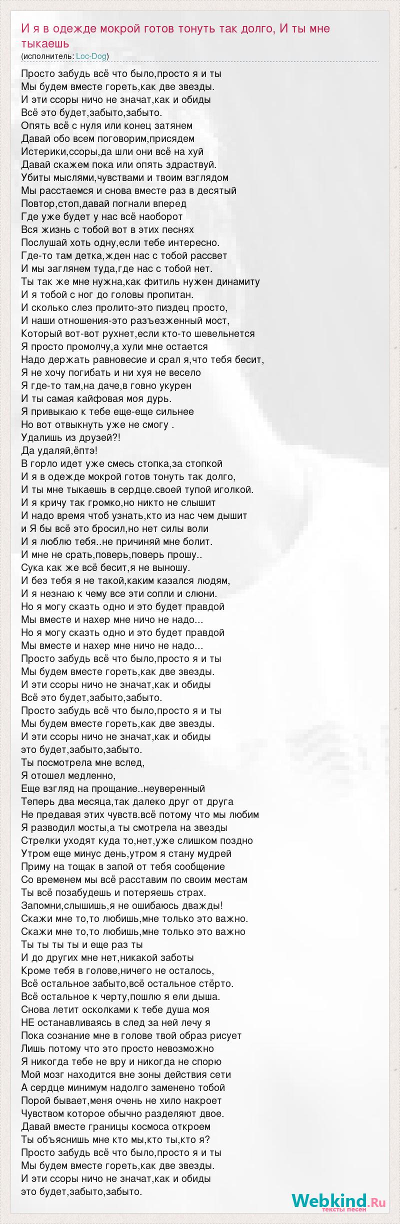 Просто забудь всё что было,просто я и ты Мы будем вместе гореть,как две звезды. И эти ссоры ничо не значат,как и обиды Всё это будет,забыто,забыто. Опять всё с нуля или конец затянем Давай обо всем поговорим,присядем Истерики,ссоры,да шли они всё на хуй Давай скажем пока или опять здраствуй. Убиты мыслями,чувствами и твоим взглядом Мы расстаемся и снова вместе раз в десятый Повтор,стоп,давай погнали вперед Где уже будет у нас всё наоборот Вся жизнь с тобой вот в этих песнях Послушай хоть одну,если тебе интересно. Где-то там детка,жден нас с тобой рассвет И мы заглянем туда,где нас с тобой нет. Ты так же мне нужна,как фитиль нужен динамиту И я тобой с ног до головы пропитан. И сколько слез пролито-это пиздец просто, И наши отношения-это разъезженный мост, Который вот-вот рухнет,если кто-то шевельнется Я просто промолчу,а хули мне остается Надо держать равновесие и срал я,что тебя бесит, Я не хочу погибать и ни хуя не весело Я где-то там,на даче,в говно укурен И ты самая кайфовая моя дурь. Я привыкаю к тебе еще-еще сильнее Но вот отвыкнуть уже не смогу . Удалишь из друзей?! Да удаляй,ёптэ! В горло идет уже смесь стопка,за стопкой И я в одежде мокрой готов тонуть так долго, И ты мне тыкаешь в сердце.своей тупой иголкой. И я кричу так громко,но никто не слышит И надо время чтоб узнать,кто из нас чем дышит и Я бы всё это бросил,но нет силы воли И я люблю тебя..не причиняй мне болит. И мне не срать,поверь,поверь прошу.. Сука как же всё бесит,я не выношу. И без тебя я не такой,каким казался людям, И я незнаю к чему все эти сопли и слюни. Но я могу сказть одно и это будет правдой Мы вместе и нахер мне ничо не надо... Но я могу сказть одно и это будет правдой Мы вместе и нахер мне ничо не надо... Просто забудь всё что было,просто я и ты Мы будем вместе гореть,как две звезды. И эти ссоры ничо не значат,как и обиды Всё это будет,забыто,забыто. Просто забудь всё что было,просто я и ты Мы будем вместе гореть,как две звезды. И эти ссоры ничо не значат,как и обиды это будет,забыто,забыто. Ты посмотрела мне вслед, Я отошел медленно, Еще взгляд на прощание..неуверенный Теперь два месяца,так далеко друг от друга Не предавая этих чувств.всё потому что мы любим Я разводил мосты,а ты смотрела на звезды Стрелки уходят куда то,нет,уже слишком поздно Утром еще минус день,утром я стану мудрей Приму на тощак в запой от тебя сообщение Со временем мы всё расставим по своим местам Ты всё позабудешь и потеряешь страх. Запомни,слышишь,я не ошибаюсь дважды! Скажи мне то,то любишь,мне только это важно. Скажи мне то,то любишь,мне только это важно Ты ты ты ты и еще раз ты И до других мне нет,никакой заботы Кроме тебя в голове,ничего не осталось, Всё остальное забыто,всё остальное стёрто. Всё остальное к черту,пошлю я ели дыша. Снова летит осколками к тебе душа моя НЕ останавливаясь в след за ней лечу я Пока сознание мне в голове твой образ рисует Лишь потому что это просто невозможно Я никогда тебе не вру и никогда не спорю Мой мозг находится вне зоны действия сети А сердце минимум надолго заменено тобой Порой бывает,меня очень не хило накроет Чувством которое обычно разделяют двое. Давай вместе границы космоса откроем Ты объяснишь мне кто мы,кто ты,кто я? Просто забудь всё что было,просто я и ты Мы будем вместе гореть,как две звезды. И эти ссоры ничо не значат,как и обиды это будет,забыто,забыто.