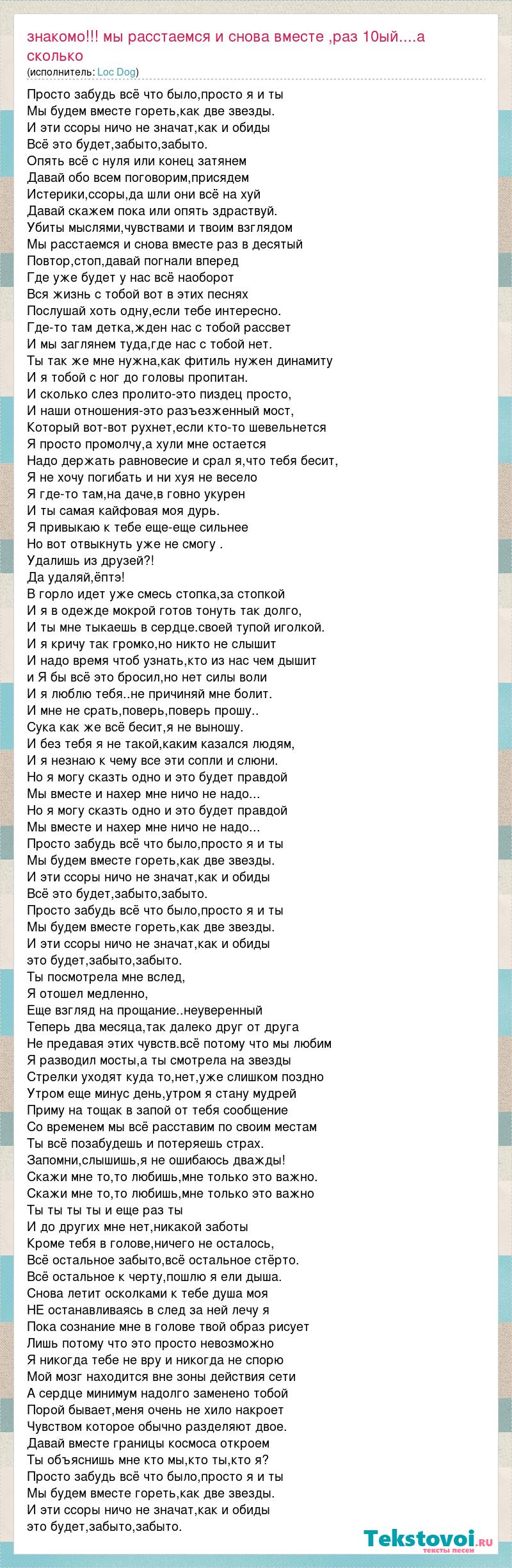 Просто забудь всё что было,просто я и ты Мы будем вместе гореть,как две звезды. И эти ссоры ничо не значат,как и обиды Всё это будет,забыто,забыто. Опять всё с нуля или конец затянем Давай обо всем поговорим,присядем Истерики,ссоры,да шли они всё на хуй Давай скажем пока или опять здраствуй. Убиты мыслями,чувствами и твоим взглядом Мы расстаемся и снова вместе раз в десятый Повтор,стоп,давай погнали вперед Где уже будет у нас всё наоборот Вся жизнь с тобой вот в этих песнях Послушай хоть одну,если тебе интересно. Где-то там детка,жден нас с тобой рассвет И мы заглянем туда,где нас с тобой нет. Ты так же мне нужна,как фитиль нужен динамиту И я тобой с ног до головы пропитан. И сколько слез пролито-это пиздец просто, И наши отношения-это разъезженный мост, Который вот-вот рухнет,если кто-то шевельнется Я просто промолчу,а хули мне остается Надо держать равновесие и срал я,что тебя бесит, Я не хочу погибать и ни хуя не весело Я где-то там,на даче,в говно укурен И ты самая кайфовая моя дурь. Я привыкаю к тебе еще-еще сильнее Но вот отвыкнуть уже не смогу . Удалишь из друзей?! Да удаляй,ёптэ! В горло идет уже смесь стопка,за стопкой И я в одежде мокрой готов тонуть так долго, И ты мне тыкаешь в сердце.своей тупой иголкой. И я кричу так громко,но никто не слышит И надо время чтоб узнать,кто из нас чем дышит и Я бы всё это бросил,но нет силы воли И я люблю тебя..не причиняй мне болит. И мне не срать,поверь,поверь прошу.. Сука как же всё бесит,я не выношу. И без тебя я не такой,каким казался людям, И я незнаю к чему все эти сопли и слюни. Но я могу сказть одно и это будет правдой Мы вместе и нахер мне ничо не надо... Но я могу сказть одно и это будет правдой Мы вместе и нахер мне ничо не надо... Просто забудь всё что было,просто я и ты Мы будем вместе гореть,как две звезды. И эти ссоры ничо не значат,как и обиды Всё это будет,забыто,забыто. Просто забудь всё что было,просто я и ты Мы будем вместе гореть,как две звезды. И эти ссоры ничо не значат,как и обиды это будет,забыто,забыто. Ты посмотрела мне вслед, Я отошел медленно, Еще взгляд на прощание..неуверенный Теперь два месяца,так далеко друг от друга Не предавая этих чувств.всё потому что мы любим Я разводил мосты,а ты смотрела на звезды Стрелки уходят куда то,нет,уже слишком поздно Утром еще минус день,утром я стану мудрей Приму на тощак в запой от тебя сообщение Со временем мы всё расставим по своим местам Ты всё позабудешь и потеряешь страх. Запомни,слышишь,я не ошибаюсь дважды! Скажи мне то,то любишь,мне только это важно. Скажи мне то,то любишь,мне только это важно Ты ты ты ты и еще раз ты И до других мне нет,никакой заботы Кроме тебя в голове,ничего не осталось, Всё остальное забыто,всё остальное стёрто. Всё остальное к черту,пошлю я ели дыша. Снова летит осколками к тебе душа моя НЕ останавливаясь в след за ней лечу я Пока сознание мне в голове твой образ рисует Лишь потому что это просто невозможно Я никогда тебе не вру и никогда не спорю Мой мозг находится вне зоны действия сети А сердце минимум надолго заменено тобой Порой бывает,меня очень не хило накроет Чувством которое обычно разделяют двое. Давай вместе границы космоса откроем Ты объяснишь мне кто мы,кто ты,кто я? Просто забудь всё что было,просто я и ты Мы будем вместе гореть,как две звезды. И эти ссоры ничо не значат,как и обиды это будет,забыто,забыто.