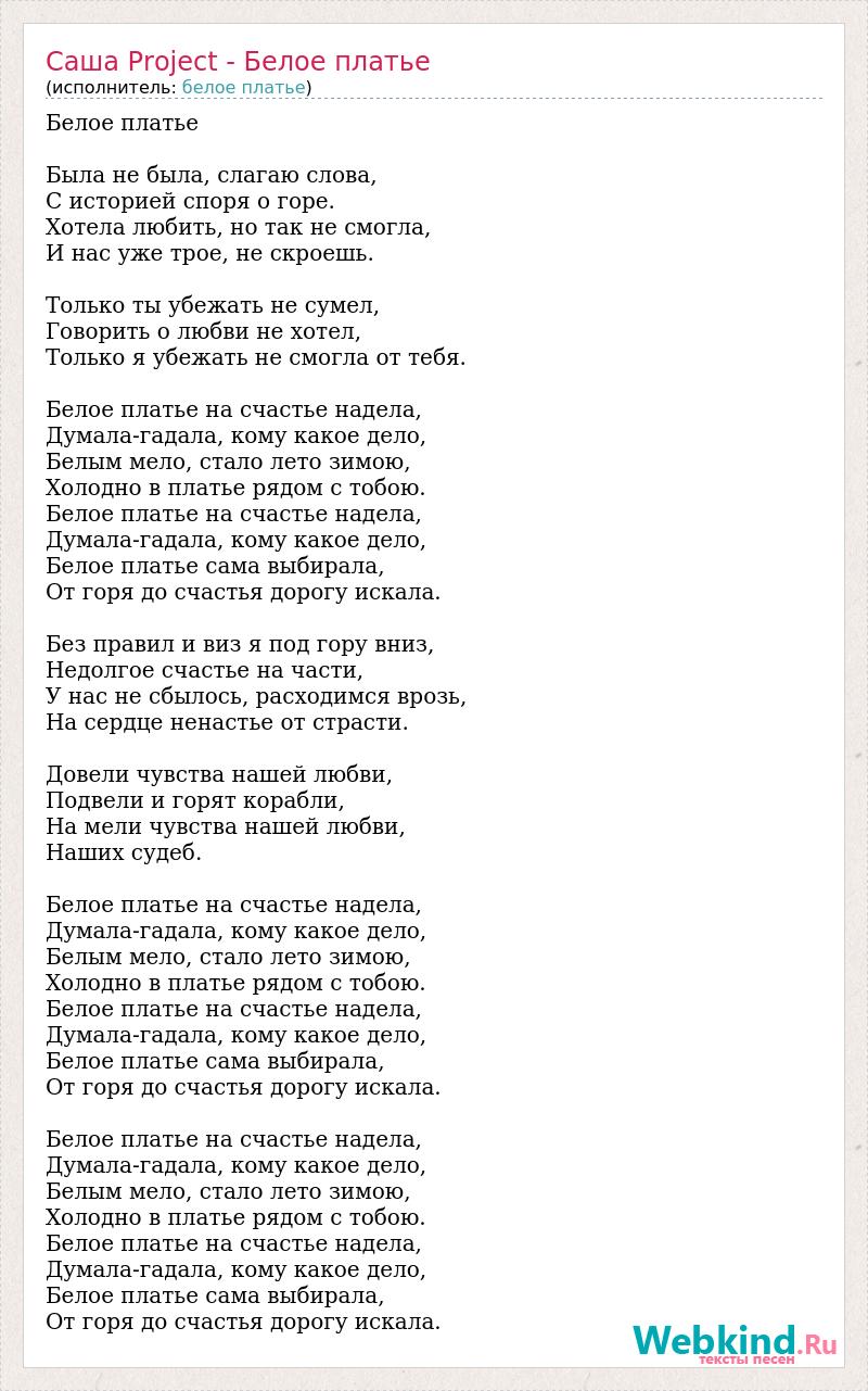 Белое платье Была не была, слагаю слова, С историей споря о горе. Хотела любить, но так не смогла, И нас уже трое, не скроешь. Только ты убежать не сумел, Говорить о любви не хотел, Только я убежать не смогла от тебя. Белое платье на счастье надела, Думала-гадала, кому какое дело, Белым мело, стало лето зимою, Холодно в платье рядом с тобою. Белое платье на счастье надела, Думала-гадала, кому какое дело, Белое платье сама выбирала, От горя до счастья дорогу искала. Без правил и виз я под гору вниз, Недолгое счастье на части, У нас не сбылось, расходимся врозь, На сердце ненастье от страсти. Довели чувства нашей любви, Подвели и горят корабли, На мели чувства нашей любви, Наших судеб. Белое платье на счастье надела, Думала-гадала, кому какое дело, Белым мело, стало лето зимою, Холодно в платье рядом с тобою. Белое платье на счастье надела, Думала-гадала, кому какое дело, Белое платье сама выбирала, От горя до счастья дорогу искала. Белое платье на счастье надела, Думала-гадала, кому какое дело, Белым мело, стало лето зимою, Холодно в платье рядом с тобою. Белое платье на счастье надела, Думала-гадала, кому какое дело, Белое платье сама выбирала, От горя до счастья дорогу искала.