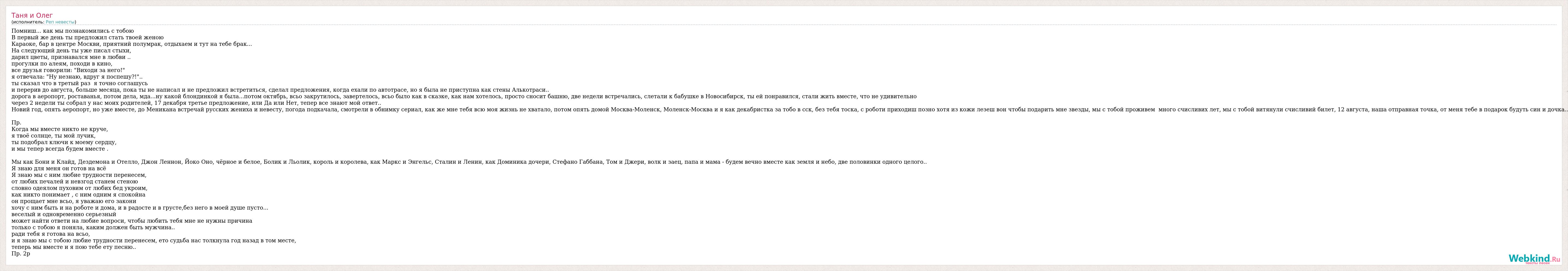 Помниш... как мы познакомились с тобою В первый же день ты предложил стать твоей женою Караоке, бар в центре Москви, приятний полумрак, отдыхаем и тут на тебе брак... На следующий день ты уже писал стыхи, дарил цветы, признавался мне в любви .. прогулки по алеям, походи в кино, все друзья говорили: "Виходи за него!" я отвечала: "Ну незнаю, вдруг я поспешу?!".. ты сказал что в третый раз я точно соглашусь и перерив до августа, больше месяца, пока ты не написал и не предложил встретиться, сделал предложения, когда ехали по автотрасе, но я была не приступна как стены Алькотраси.. дорога в аеропорт, роставанья, потом дела, мда...ну какой блондинкой я была...потом октябрь, всьо закрутилось, завертелось, всьо было как в сказке, как нам хотелось, просто сносит башню, две недели встречались, слетали к бабушке в Новосибирск, ты ей понравился, стали жить вместе, что не удивительно через 2 недели ты собрал у нас моих родителей, 17 декабря третье предложение, или Да или Нет, тепер все знают мой ответ.. Новий год, опять аеропорт, но уже вместе, до Меникана встречай русских жениха и невесту, погода подкачала, смотрели в обнимку сериал, как же мне тебя всю моя жизнь не хватало, потом опять домой Москва-Моленск, Моленск-Москва и я как декабристка за тобо в сск, без тебя тоска, с роботи приходиш позно хотя из кожи лезеш вон чтобы подарить мне звезды, мы с тобой проживем много счисливих лет, мы с тобой витянули счисливий билет, 12 августа, наша отправная точка, от меня тебе в подарок будуть син и дочка.. Пр. Когда мы вместе никто не круче, я твоё солнце, ты мой лучик, ты подобрал ключи к моему сердцу, и мы тепер всегда будем вместе . Мы как Бони и Клайд, Дездемона и Отелло, Джон Леннон, Йоко Оно, чёрное и белое, Болик и Льолик, король и королева, как Маркс и Энгельс, Сталин и Ленин, как Доминика дочери, Стефано Габбана, Том и Джери, волк и заец, папа и мама - будем вечно вместе как земля и небо, две половинки одного целого.. Я знаю для меня он готов на всё Я знаю мы с ним любие трудности перенесем, от любих печалей и невзгод станем стеною словно одеялом пуховим от любих бед укроим, как никто понимает , с ним одним я спокойна он прощает мне всьо, я уважаю его закони хочу с ним быть и на роботе и дома, и в радосте и в грусте,без него в моей душе пусто... веселый и одновременно серьезный может найти ответи на любие вопроси, чтобы любить тебя мне не нужны причина только с тобою я поняла, каким должен быть мужчина.. ради тебя я готова на всьо, и я знаю мы с тобою любие трудности перенесем, ето судьба нас толкнула год назад в том месте, теперь мы вместе и я пою тебе ету песню.. Пр. 2р