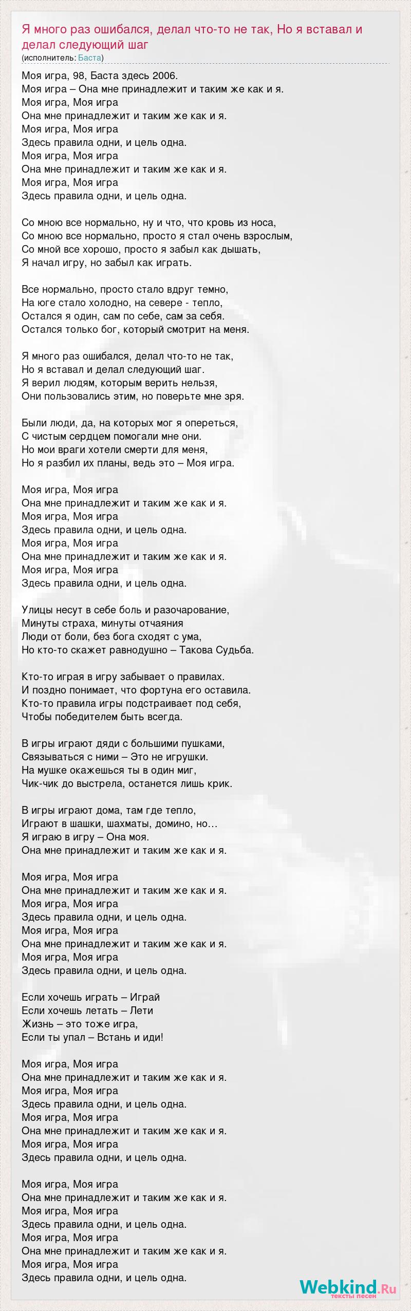 Моя игра, 98, Баста здесь 2006. Моя игра – Она мне принадлежит и таким же как и я. Моя игра, Моя игра Она мне принадлежит и таким же как и я. Моя игра, Моя игра Здесь правила одни, и цель одна. Моя игра, Моя игра Она мне принадлежит и таким же как и я. Моя игра, Моя игра Здесь правила одни, и цель одна. Со мною все нормально, ну и что, что кровь из носа, Со мною все нормально, просто я стал очень взрослым, Со мной все хорошо, просто я забыл как дышать, Я начал игру, но забыл как играть. Все нормально, просто стало вдруг темно, На юге стало холодно, на севере - тепло, Остался я один, сам по себе, сам за себя. Остался только бог, который смотрит на меня. Я много раз ошибался, делал что-то не так, Но я вставал и делал следующий шаг. Я верил людям, которым верить нельзя, Они пользовались этим, но поверьте мне зря. Были люди, да, на которых мог я опереться, С чистым сердцем помогали мне они. Но мои враги хотели смерти для меня, Но я разбил их планы, ведь это – Моя игра. Моя игра, Моя игра Она мне принадлежит и таким же как и я. Моя игра, Моя игра Здесь правила одни, и цель одна. Моя игра, Моя игра Она мне принадлежит и таким же как и я. Моя игра, Моя игра Здесь правила одни, и цель одна. Улицы несут в себе боль и разочарование, Минуты страха, минуты отчаяния Люди от боли, без бога сходят с ума, Но кто-то скажет равнодушно – Такова Судьба. Кто-то играя в игру забывает о правилах. И поздно понимает, что фортуна его оставила. Кто-то правила игры подстраивает под себя, Чтобы победителем быть всегда. В игры играют дяди с большими пушками, Связываться с ними – Это не игрушки. На мушке окажешься ты в один миг, Чик-чик до выстрела, останется лишь крик. В игры играют дома, там где тепло, Играют в шашки, шахматы, домино, но… Я играю в игру – Она моя. Она мне принадлежит и таким же как и я. Моя игра, Моя игра Она мне принадлежит и таким же как и я. Моя игра, Моя игра Здесь правила одни, и цель одна. Моя игра, Моя игра Она мне принадлежит и таким же как и я. Моя игра, Моя игра Здесь правила одни, и цель одна. Если хочешь играть – Играй Если хочешь летать – Лети Жизнь – это тоже игра, Если ты упал – Встань и иди! Моя игра, Моя игра Она мне принадлежит и таким же как и я. Моя игра, Моя игра Здесь правила одни, и цель одна. Моя игра, Моя игра Она мне принадлежит и таким же как и я. Моя игра, Моя игра Здесь правила одни, и цель одна. Моя игра, Моя игра Она мне принадлежит и таким же как и я. Моя игра, Моя игра Здесь правила одни, и цель одна. Моя игра, Моя игра Она мне принадлежит и таким же как и я. Моя игра, Моя игра Здесь правила одни, и цель одна.