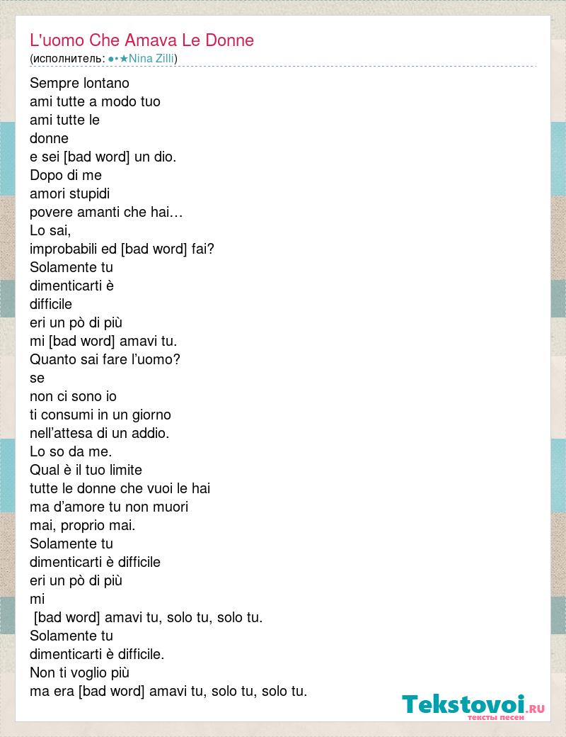 Sempre lontano ami tutte a modo tuo ami tutte le donne e sei [bad word] un dio. Dopo di me amori stupidi povere amanti che hai… Lo sai, improbabili ed [bad word] fai? Solamente tu dimenticarti è difficile eri un pò di più mi [bad word] amavi tu. Quanto sai fare l’uomo? se non ci sono io ti consumi in un giorno nell’attesa di un addio. Lo so da me. Qual è il tuo limite tutte le donne che vuoi le hai ma d’amore tu non muori mai, proprio mai. Solamente tu dimenticarti è difficile eri un pò di più mi [bad word] amavi tu, solo tu, solo tu. Solamente tu dimenticarti è difficile. Non ti voglio più ma era [bad word] amavi tu, solo tu, solo tu.