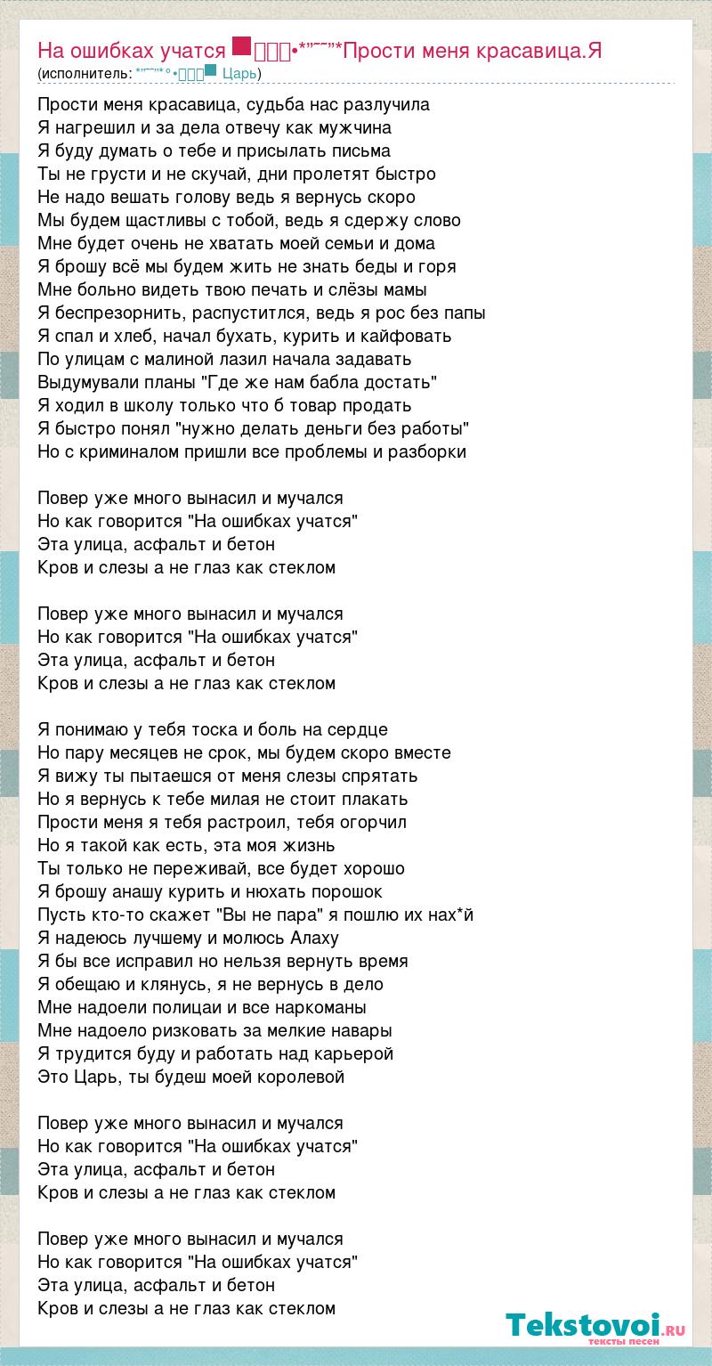 Прости меня красавица, судьба нас разлучила Я нагрешил и за дела отвечу как мужчина Я буду думать о тебе и присылать письма Ты не грусти и не скучай, дни пролетят быстро Не надо вешать голову ведь я вернусь скоро Мы будем щастливы с тобой, ведь я сдержу слово Мне будет очень не хватать моей семьи и дома Я брошу всё мы будем жить не знать беды и горя Мне больно видеть твою печать и слёзы мамы Я беспрезорнить, распуститлся, ведь я рос без папы Я спал и хлеб, начал бухать, курить и кайфовать По улицам с малиной лазил начала задавать Выдумували планы "Где же нам бабла достать" Я ходил в школу только что б товар продать Я быстро понял "нужно делать деньги без работы" Но с криминалом пришли все проблемы и разборки Повер уже много вынасил и мучался Но как говорится "На ошибках учатся" Эта улица, асфальт и бетон Кров и слезы а не глаз как стеклом Повер уже много вынасил и мучался Но как говорится "На ошибках учатся" Эта улица, асфальт и бетон Кров и слезы а не глаз как стеклом Я понимаю у тебя тоска и боль на сердце Но пару месяцев не срок, мы будем скоро вместе Я вижу ты пытаешся от меня слезы спрятать Но я вернусь к тебе милая не стоит плакать Прости меня я тебя растроил, тебя огорчил Но я такой как есть, эта моя жизнь Ты только не переживай, все будет хорошо Я брошу анашу курить и нюхать порошок Пусть кто-то скажет "Вы не пара" я пошлю их нах*й Я надеюсь лучшему и молюсь Алаху Я бы все исправил но нельзя вернуть время Я обещаю и клянусь, я не вернусь в дело Мне надоели полицаи и все наркоманы Мне надоело ризковать за мелкие навары Я трудится буду и работать над карьерой Это Царь, ты будеш моей королевой Повер уже много вынасил и мучался Но как говорится "На ошибках учатся" Эта улица, асфальт и бетон Кров и слезы а не глаз как стеклом Повер уже много вынасил и мучался Но как говорится "На ошибках учатся" Эта улица, асфальт и бетон Кров и слезы а не глаз как стеклом