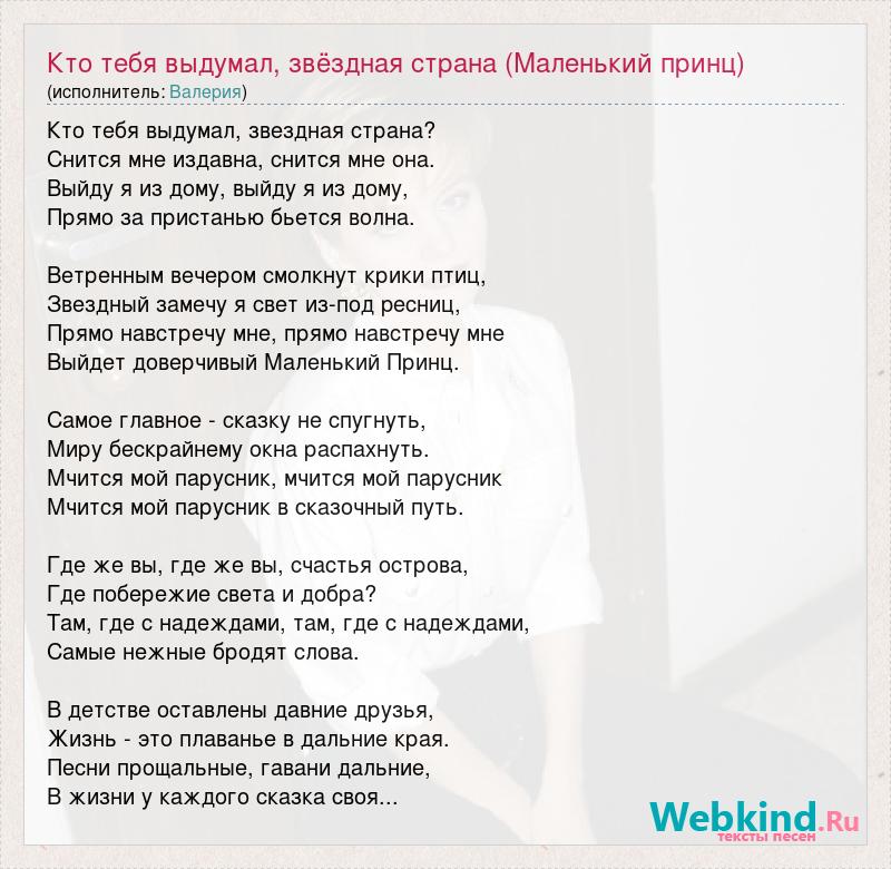 Кто тебя выдумал, звездная страна? Снится мне издавна, снится мне она. Выйду я из дому, выйду я из дому, Прямо за пристанью бьется волна. Ветренным вечером смолкнут крики птиц, Звездный замечу я свет из-под pесниц, Прямо навстречу мне, прямо навстречу мне Выйдет доверчивый Маленький Принц. Самое главное - сказку не спугнуть, Миру бескрайнему окна распахнуть. Мчится мой парусник, мчится мой парусник Мчится мой парусник в сказочный путь. Где же вы, где же вы, счастья острова, Где побережие света и добра? Там, где с надеждами, там, где с надеждами, Самые нежные бродят слова. В детстве оставлены давние друзья, Жизнь - это плаванье в дальние края. Песни прощальные, гавани дальние, В жизни у каждого сказка своя...