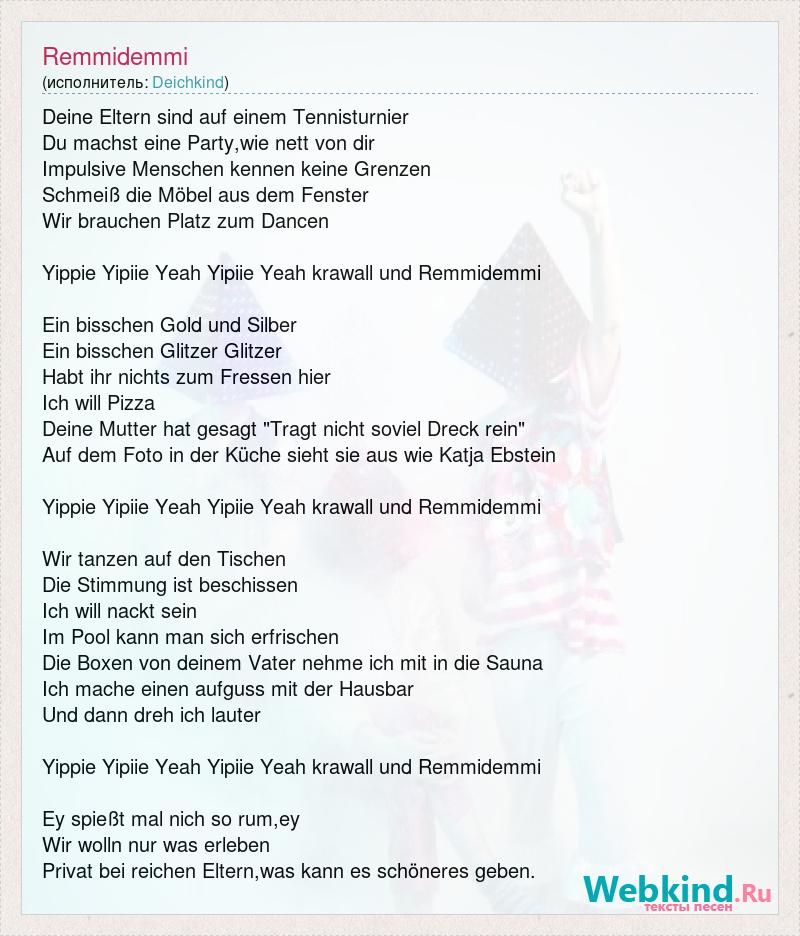 Deine Eltern sind auf einem Tennisturnier Du machst eine Party,wie nett von dir Impulsive Menschen kennen keine Grenzen Schmeiß die Möbel aus dem Fenster Wir brauchen Platz zum Dancen Yippie Yipiie Yeah Yipiie Yeah krawall und Remmidemmi Ein bisschen Gold und Silber Ein bisschen Glitzer Glitzer Habt ihr nichts zum Fressen hier Ich will Pizza Deine Mutter hat gesagt "Tragt nicht soviel Dreck rein" Auf dem Foto in der Küche sieht sie aus wie Katja Ebstein Yippie Yipiie Yeah Yipiie Yeah krawall und Remmidemmi Wir tanzen auf den Tischen Die Stimmung ist beschissen Ich will nackt sein Im Pool kann man sich erfrischen Die Boxen von deinem Vater nehme ich mit in die Sauna Ich mache einen aufguss mit der Hausbar Und dann dreh ich lauter Yippie Yipiie Yeah Yipiie Yeah krawall und Remmidemmi Ey spießt mal nich so rum,ey Wir wolln nur was erleben Privat bei reichen Eltern,was kann es schöneres geben.