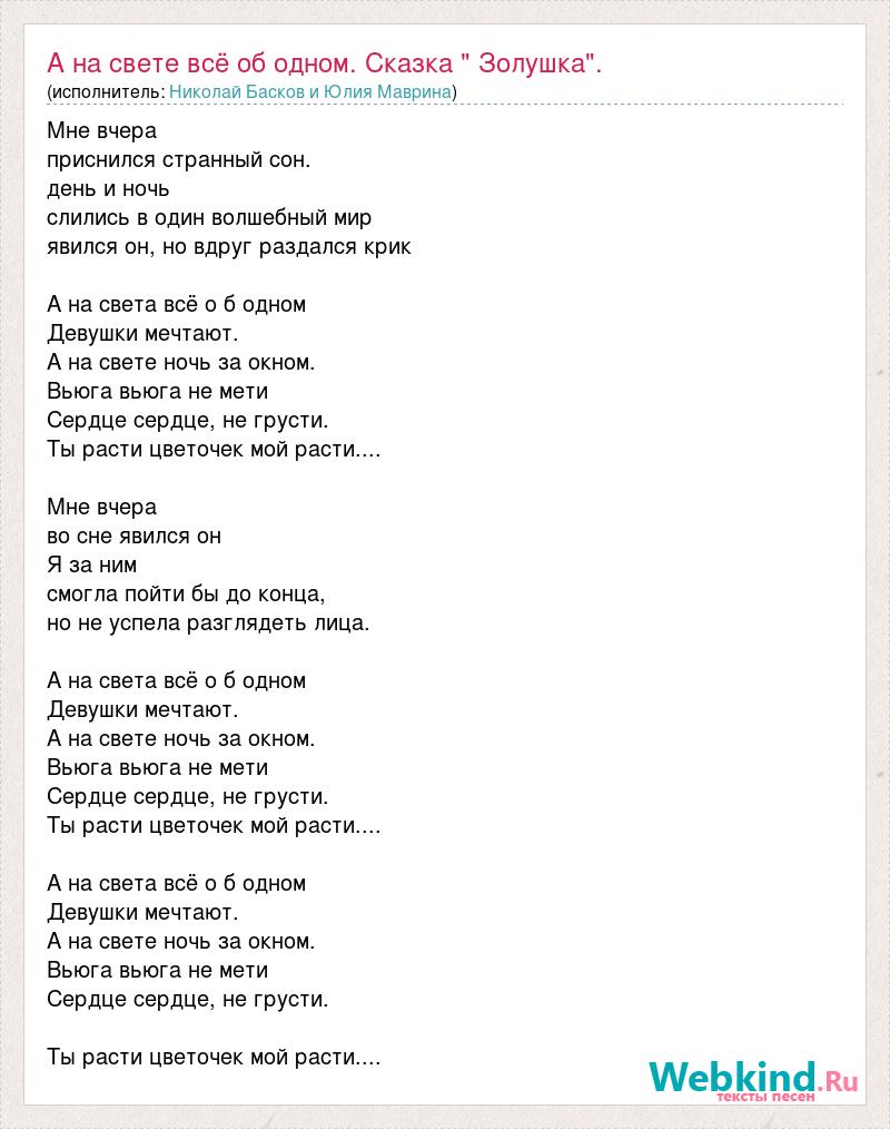 Мне вчера приснился странный сон. день и ночь слились в один волшебный мир явился он, но вдруг раздался крик А на света всё о б одном Девушки мечтают. А на свете ночь за окном. Вьюга вьюга не мети Сердце сердце, не грусти. Ты расти цветочек мой расти.... Мне вчера во сне явился он Я за ним смогла пойти бы до конца, но не успела разглядеть лица. А на света всё о б одном Девушки мечтают. А на свете ночь за окном. Вьюга вьюга не мети Сердце сердце, не грусти. Ты расти цветочек мой расти.... А на света всё о б одном Девушки мечтают. А на свете ночь за окном. Вьюга вьюга не мети Сердце сердце, не грусти. Ты расти цветочек мой расти....