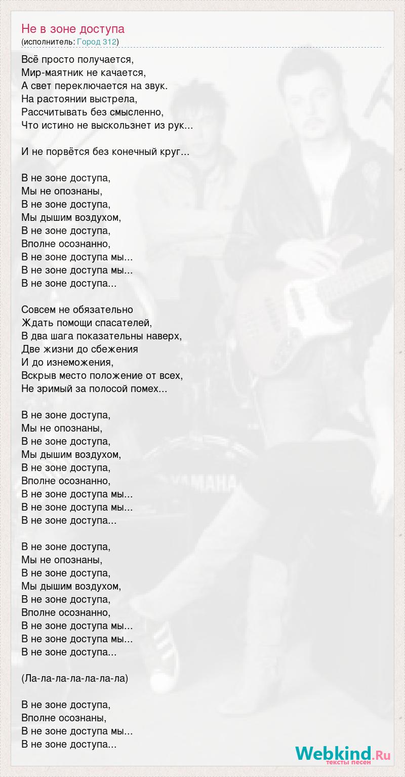 Всё просто получается, Мир-маятник не качается, А свет переключается на звук. На растоянии выстрела, Рассчитывать без смысленно, Что истино не выскользнет из рук... И не порвётся без конечный круг... В не зоне доступа, Мы не опознаны, В не зоне доступа, Мы дышим воздухом, В не зоне доступа, Вполне осознанно, В не зоне доступа мы... В не зоне доступа мы... В не зоне доступа... Совсем не обязательно Ждать помощи спасателей, В два шага показательны наверх, Две жизни до сбежения И до изнеможения, Вскрыв место положение от всех, Не зримый за полосой помех... В не зоне доступа, Мы не опознаны, В не зоне доступа, Мы дышим воздухом, В не зоне доступа, Вполне осознанно, В не зоне доступа мы... В не зоне доступа мы... В не зоне доступа... В не зоне доступа, Мы не опознаны, В не зоне доступа, Мы дышим воздухом, В не зоне доступа, Вполне осознанно, В не зоне доступа мы... В не зоне доступа мы... В не зоне доступа... (Ла-ла-ла-ла-ла-ла-ла) В не зоне доступа, Вполне осознаны, В не зоне доступа мы... В не зоне доступа...