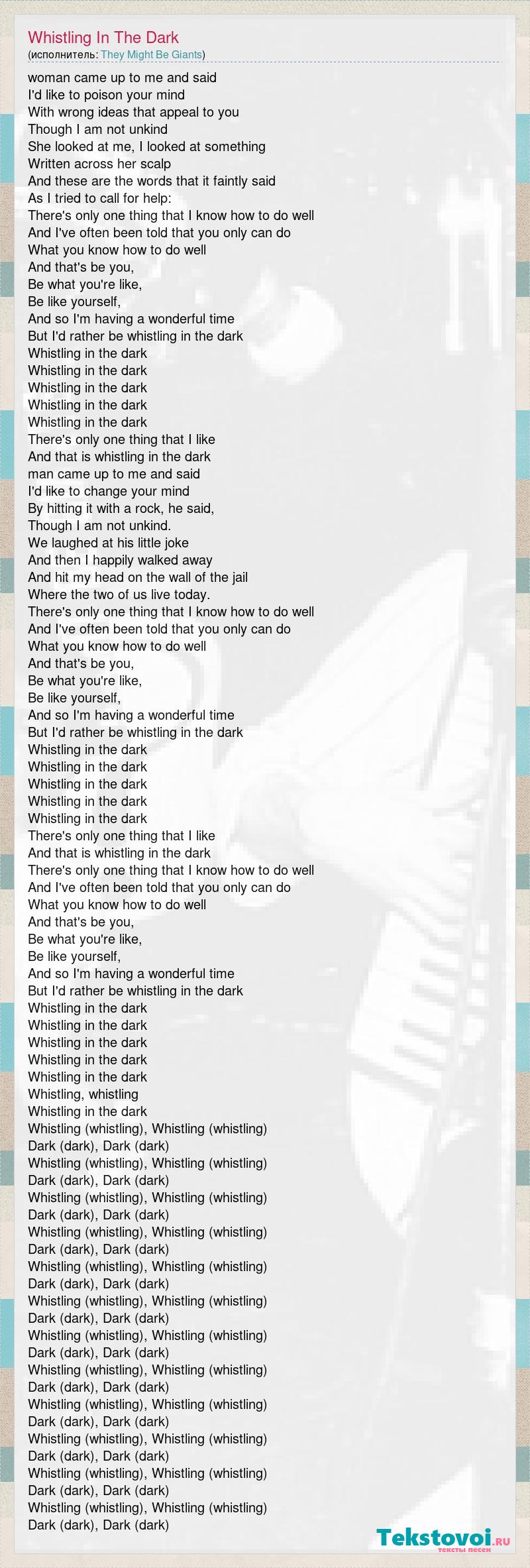 woman came up to me and said I'd like to poison your mind With wrong ideas that appeal to you Though I am not unkind She looked at me, I looked at something Written across her scalp And these are the words that it faintly said As I tried to call for help: There's only one thing that I know how to do well And I've often been told that you only can do What you know how to do well And that's be you, Be what you're like, Be like yourself, And so I'm having a wonderful time But I'd rather be whistling in the dark Whistling in the dark Whistling in the dark Whistling in the dark Whistling in the dark Whistling in the dark There's only one thing that I like And that is whistling in the dark man came up to me and said I'd like to change your mind By hitting it with a rock, he said, Though I am not unkind. We laughed at his little joke And then I happily walked away And hit my head on the wall of the jail Where the two of us live today. There's only one thing that I know how to do well And I've often been told that you only can do What you know how to do well And that's be you, Be what you're like, Be like yourself, And so I'm having a wonderful time But I'd rather be whistling in the dark Whistling in the dark Whistling in the dark Whistling in the dark Whistling in the dark Whistling in the dark There's only one thing that I like And that is whistling in the dark There's only one thing that I know how to do well And I've often been told that you only can do What you know how to do well And that's be you, Be what you're like, Be like yourself, And so I'm having a wonderful time But I'd rather be whistling in the dark Whistling in the dark Whistling in the dark Whistling in the dark Whistling in the dark Whistling in the dark Whistling, whistling Whistling in the dark Whistling (whistling), Whistling (whistling) Dark (dark), Dark (dark) Whistling (whistling), Whistling (whistling) Dark (dark), Dark (dark) Whistling (whistling), Whistling (whistling) Dark (dark), Dark (dark) Whistling (whistling), Whistling (whistling) Dark (dark), Dark (dark) Whistling (whistling), Whistling (whistling) Dark (dark), Dark (dark) Whistling (whistling), Whistling (whistling) Dark (dark), Dark (dark) Whistling (whistling), Whistling (whistling) Dark (dark), Dark (dark) Whistling (whistling), Whistling (whistling) Dark (dark), Dark (dark) Whistling (whistling), Whistling (whistling) Dark (dark), Dark (dark) Whistling (whistling), Whistling (whistling) Dark (dark), Dark (dark) Whistling (whistling), Whistling (whistling) Dark (dark), Dark (dark) Whistling (whistling), Whistling (whistling) Dark (dark), Dark (dark)