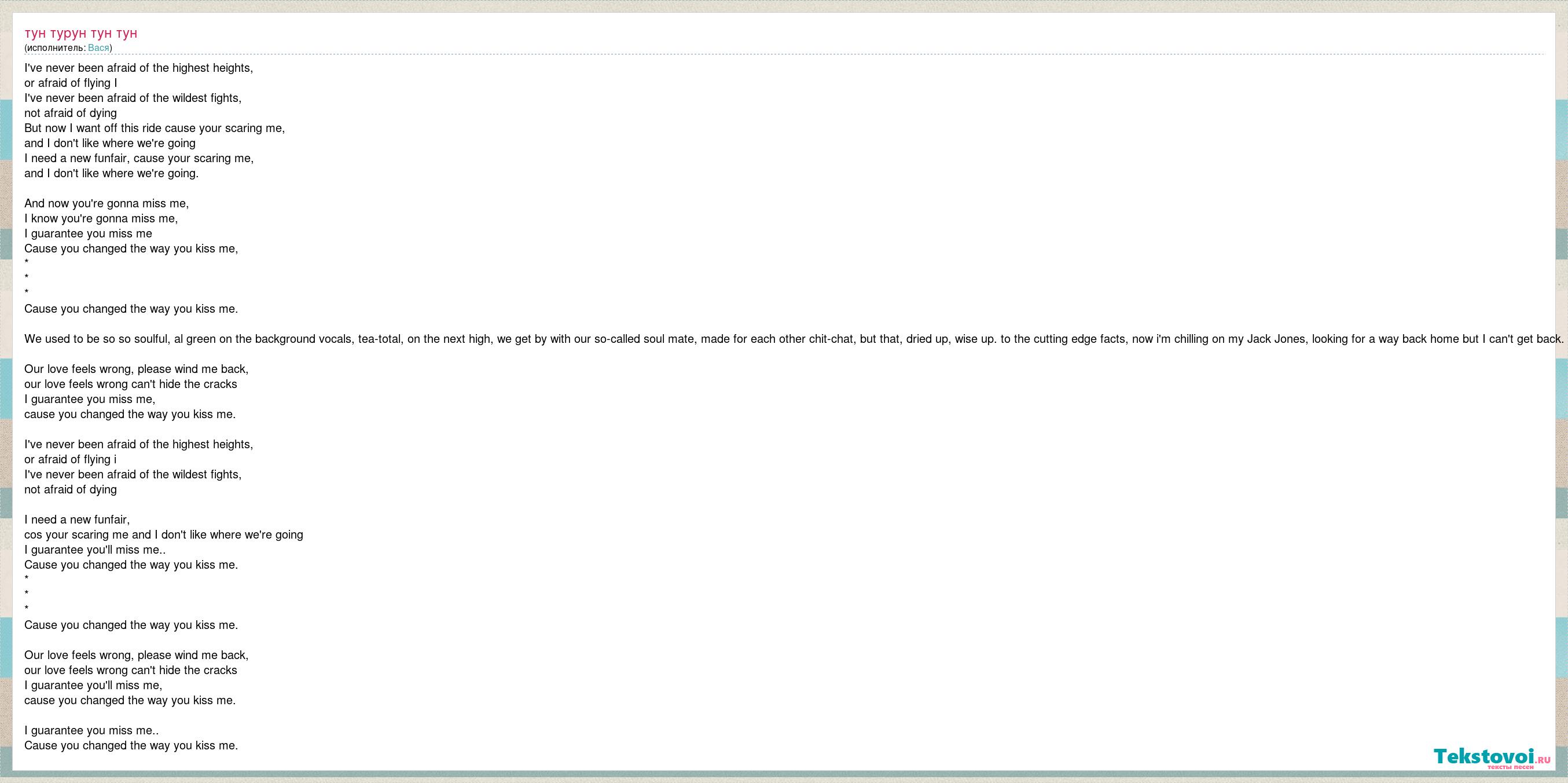 I've never been afraid of the highest heights, or afraid of flying I I've never been afraid of the wildest fights, not afraid of dying But now I want off this ride cause your scaring me, and I don't like where we're going I need a new funfair, cause your scaring me, and I don't like where we're going. And now you're gonna miss me, I know you're gonna miss me, I guarantee you miss me Cause you changed the way you kiss me, * * * Cause you changed the way you kiss me. We used to be so so soulful, al green on the background vocals, tea-total, on the next high, we get by with our so-called soul mate, made for each other chit-chat, but that, dried up, wise up. to the cutting edge facts, now i'm chilling on my Jack Jones, looking for a way back home but I can't get back. Our love feels wrong, please wind me back, our love feels wrong can't hide the cracks I guarantee you miss me, cause you changed the way you kiss me. I've never been afraid of the highest heights, or afraid of flying i I've never been afraid of the wildest fights, not afraid of dying I need a new funfair, cos your scaring me and I don't like where we're going I guarantee you'll miss me.. Cause you changed the way you kiss me. * * * Cause you changed the way you kiss me. Our love feels wrong, please wind me back, our love feels wrong can't hide the cracks I guarantee you'll miss me, cause you changed the way you kiss me. I guarantee you miss me.. Cause you changed the way you kiss me.