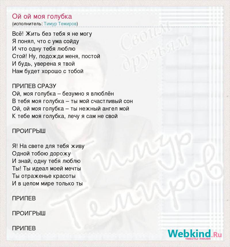 Всё! Жить без тебя я не могу Я понял, что с ума сойду И что одну тебя люблю Стой! Ну, подожди меня, постой И будь, уверена я твой Нам будет хорошо с тобой ПРИПЕВ СРАЗУ Ой, моя голубка – безумно я влюблён В тебя моя голубка – ты мой счастливый сон Ой, ой моя голубка – ты нежный ангел мой К тебе моя голубка, лечу я сам не свой ПРОИГРЫШ Я! На свете для тебя живу Одной тобою дорожу И знай, одну тебя люблю Ты! Ты идеал моей мечты Ты отраженье красоты И в целом мире только ты ПРИПЕВ ПРОИГРЫШ ПРИПЕВ