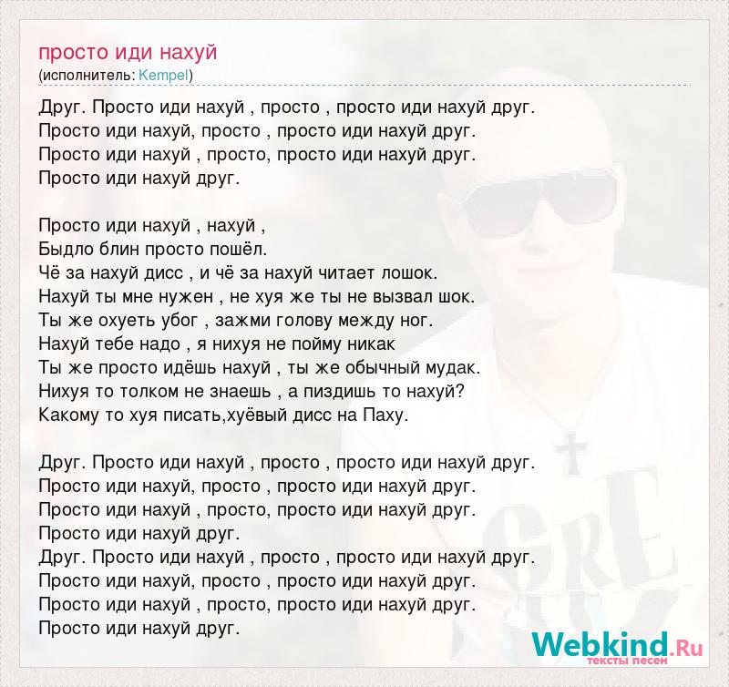 Друг. Просто иди нахуй , просто , просто иди нахуй друг. Просто иди нахуй, просто , просто иди нахуй друг. Просто иди нахуй , просто, просто иди нахуй друг. Просто иди нахуй друг. Просто иди нахуй , нахуй , Быдло блин просто пошёл. Чё за нахуй дисс , и чё за нахуй читает лошок. Нахуй ты мне нужен , не хуя же ты не вызвал шок. Ты же охуеть убог , зажми голову между ног. Нахуй тебе надо , я нихуя не пойму никак Ты же просто идёшь нахуй , ты же обычный мудак. Нихуя то толком не знаешь , а пиздишь то нахуй? Какому то хуя писать,хуёвый дисс на Паху. Друг. Просто иди нахуй , просто , просто иди нахуй друг. Просто иди нахуй, просто , просто иди нахуй друг. Просто иди нахуй , просто, просто иди нахуй друг. Просто иди нахуй друг. Друг. Просто иди нахуй , просто , просто иди нахуй друг. Просто иди нахуй, просто , просто иди нахуй друг. Просто иди нахуй , просто, просто иди нахуй друг. Просто иди нахуй друг.