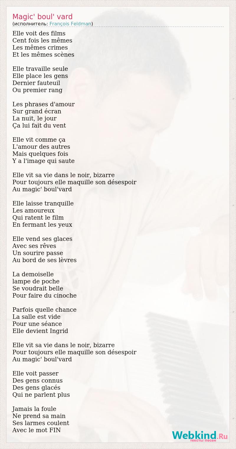 Elle voit des films Cent fois les mêmes Les mêmes crimes Et les mêmes scènes Elle travaille seule Elle place les gens Dernier fauteuil Ou premier rang Les phrases d'amour Sur grand écran La nuit, le jour Ça lui fait du vent Elle vit comme ça L'amour des autres Mais quelques fois Y a l'image qui saute Elle vit sa vie dans le noir, bizarre Pour toujours elle maquille son désespoir Au magic' boul'vard Elle laisse tranquille Les amoureux Qui ratent le film En fermant les yeux Elle vend ses glaces Avec ses rêves Un sourire passe Au bord de ses lèvres La demoiselle lampe de poche Se voudrait belle Pour faire du cinoche Parfois quelle chance La salle est vide Pour une séance Elle devient Ingrid Elle vit sa vie dans le noir, bizarre Pour toujours elle maquille son désespoir Au magic' boul'vard Elle voit passer Des gens connus Des gens glacés Qui ne parlent plus Jamais la foule Ne prend sa main Ses larmes coulent Avec le mot FIN