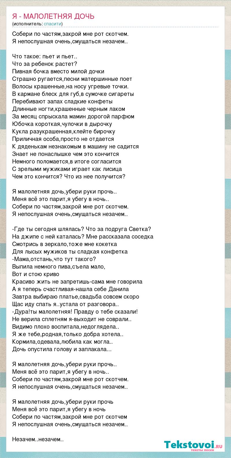 Собери по частям,закрой мне рот скотчем. Я непослушная очень,смущаться незачем.. Что такое: пьет и пьет.. Что за ребенок растет? Пивная бочка вместо милой дочки Страшно ругается,песни матершинные поет Волосы крашенные,на носу угревые точки. В кармане блеск для губ,в сумочке сигареты Перебивают запах сладкие конфеты Длинные ногти,крашенные черным лаком За месяц спрыскала мамин дорогой парфюм Юбочка короткая,чулочки в дырочку Кукла разукрашенная,клейте бирочку Приличная особа,просто не отдается К дяденькам незнакомым в машину не садится Знает не понаслышке чем это кончится Немного поломается,в итоге согласится С зрелыми мужиками играет как лисица Чем это кончится? Что из нее получится? Я малолетняя дочь,убери руки прочь.. Меня всё это парит,я убегу в ночь.. Собери по частям,закрой мне рот скотчем. Я непослушная очень,смущаться незачем.. -Где ты сегодня шлялась? Что за подруга Светка? На джипе с ней каталась? Мне рассказала соседка Смотрись в зеркало,тоже мне кокетка Для лысых мужиков ты сладкая конфетка -Мама,отстань,что тут такого? Выпила немного пива,съела мало, Вот и стою криво Красиво жить не запретишь-сама мне говорила А я теперь счастливая-нашла себе Данила Завтра выбираю платье,свадьба совсем скоро Щас иду спать я..устала от разговора.. -Дура!ты малолетняя! Правду о тебе сказали! Не верила сплетням я-выходит не соврали.. Видимо плохо воспитала,недоглядела.. Я же тебе,родная,только добра хотела.. Кормила,одевала,любила как могла.. Дочь опустила голову и заплакала... Я малолетняя дочь,убери руки прочь.. Меня всё это парит,я убегу в ночь.. Собери по частям,закрой мне рот скотчем. Я непослушная очень,смущаться незачем.. Я малолетняя дочь,убери руки прочь Меня всё это парит,я убегу в ночь Собери по частям,закрой мне рот скотчем Я непослушная очень,смущаться незачем.. Незачем..незачем..