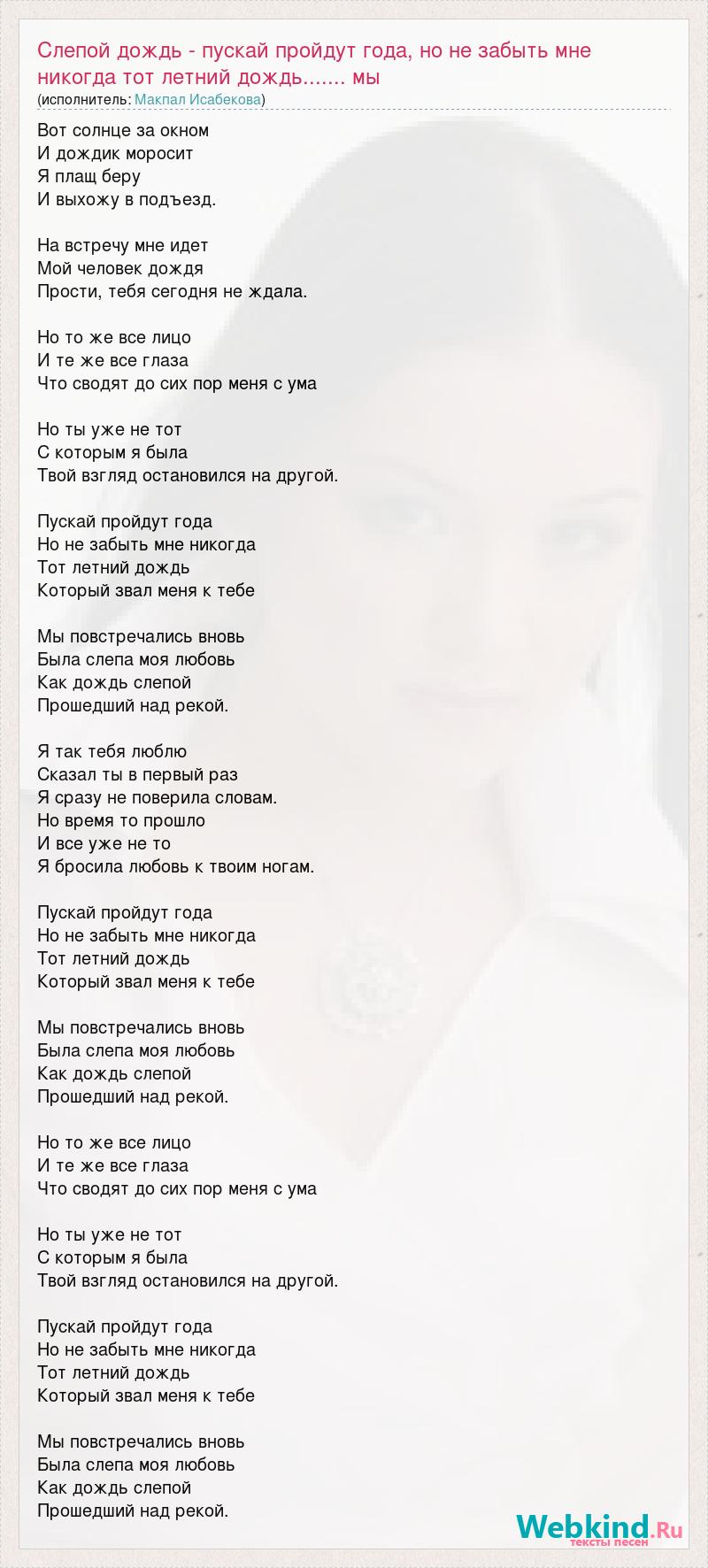 Вот солнце за окном И дождик моросит Я плащ беру И выхожу в подъезд. На встречу мне идет Мой человек дождя Прости, тебя сегодня не ждала. Но то же все лицо И те же все глаза Что сводят до сих пор меня с ума Но ты уже не тот С которым я была Твой взгляд остановился на другой. Пускай пройдут года Но не забыть мне никогда Тот летний дождь Который звал меня к тебе Мы повстречались вновь Была слепа моя любовь Как дождь слепой Прошедший над рекой. Я так тебя люблю Сказал ты в первый раз Я сразу не поверила словам. Но время то прошло И все уже не то Я бросила любовь к твоим ногам. Пускай пройдут года Но не забыть мне никогда Тот летний дождь Который звал меня к тебе Мы повстречались вновь Была слепа моя любовь Как дождь слепой Прошедший над рекой. Но то же все лицо И те же все глаза Что сводят до сих пор меня с ума Но ты уже не тот С которым я была Твой взгляд остановился на другой. Пускай пройдут года Но не забыть мне никогда Тот летний дождь Который звал меня к тебе Мы повстречались вновь Была слепа моя любовь Как дождь слепой Прошедший над рекой.