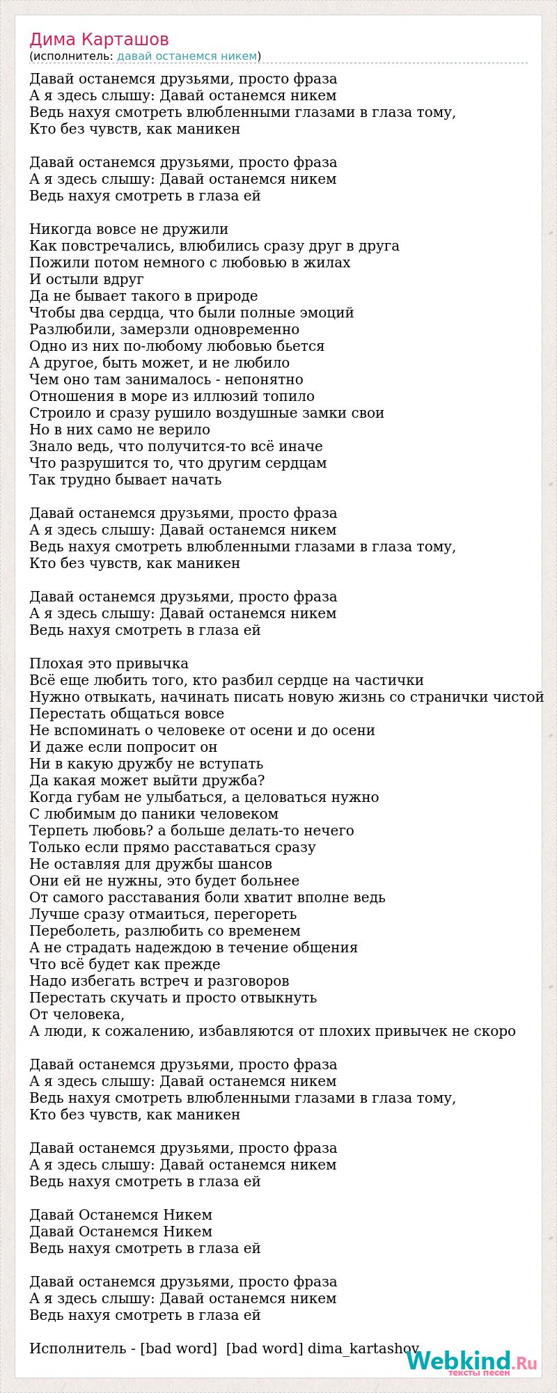 Давай останемся друзьями, просто фраза А я здесь слышу: Давай останемся никем Ведь нахуя смотреть влюбленными глазами в глаза тому, Кто без чувств, как маникен Давай останемся друзьями, просто фраза А я здесь слышу: Давай останемся никем Ведь нахуя смотреть в глаза ей Никогда вовсе не дружили Как повстречались, влюбились сразу друг в друга Пожили потом немного с любовью в жилах И остыли вдруг Да не бывает такого в природе Чтобы два сердца, что были полные эмоций Разлюбили, замерзли одновременно Одно из них по-любому любовью бьется А другое, быть может, и не любило Чем оно там занималось - непонятно Отношения в море из иллюзий топило Строило и сразу рушило воздушные замки свои Но в них само не верило Знало ведь, что получится-то всё иначе Что разрушится то, что другим сердцам Так трудно бывает начать Давай останемся друзьями, просто фраза А я здесь слышу: Давай останемся никем Ведь нахуя смотреть влюбленными глазами в глаза тому, Кто без чувств, как маникен Давай останемся друзьями, просто фраза А я здесь слышу: Давай останемся никем Ведь нахуя смотреть в глаза ей Плохая это привычка Всё еще любить того, кто разбил сердце на частички Нужно отвыкать, начинать писать новую жизнь со странички чистой Перестать общаться вовсе Не вспоминать о человеке от осени и до осени И даже если попросит он Ни в какую дружбу не вступать Да какая может выйти дружба? Когда губам не улыбаться, а целоваться нужно С любимым до паники человеком Терпеть любовь? а больше делать-то нечего Только если прямо расставаться сразу Не оставляя для дружбы шансов Они ей не нужны, это будет больнее От самого расставания боли хватит вполне ведь Лучше сразу отмаиться, перегореть Переболеть, разлюбить со временем А не страдать надеждою в течение общения Что всё будет как прежде Надо избегать встреч и разговоров Перестать скучать и просто отвыкнуть От человека, А люди, к сожалению, избавляются от плохих привычек не скоро Давай останемся друзьями, просто фраза А я здесь слышу: Давай останемся никем Ведь нахуя смотреть влюбленными глазами в глаза тому, Кто без чувств, как маникен Давай останемся друзьями, просто фраза А я здесь слышу: Давай останемся никем Ведь нахуя смотреть в глаза ей Давай Останемся Никем Давай Останемся Никем Ведь нахуя смотреть в глаза ей Давай останемся друзьями, просто фраза А я здесь слышу: Давай останемся никем Ведь нахуя смотреть в глаза ей Исполнитель - [bad word] [bad word] dima_kartashov