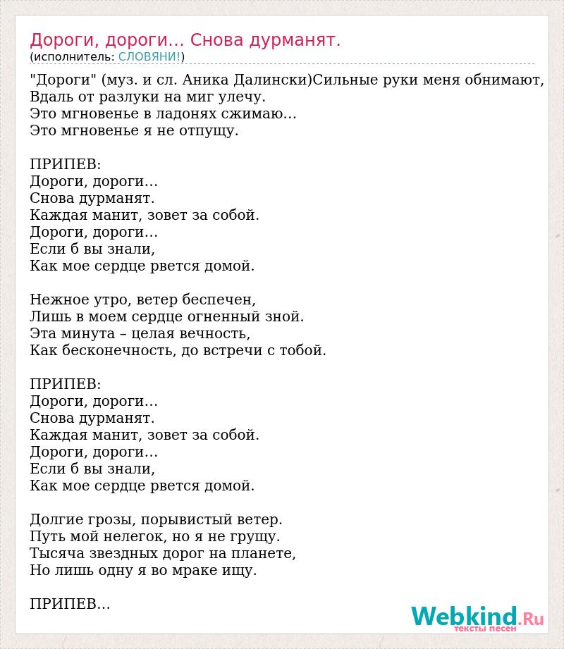 "Дороги" (муз. и сл. Аника Далински)Сильные руки меня обнимают, Вдаль от разлуки на миг улечу. Это мгновенье в ладонях сжимаю… Это мгновенье я не отпущу. ПРИПЕВ: Дороги, дороги… Снова дурманят. Каждая манит, зовет за собой. Дороги, дороги… Если б вы знали, Как мое сердце рвется домой. Нежное утро, ветер беспечен, Лишь в моем сердце огненный зной. Эта минута – целая вечность, Как бесконечность, до встречи с тобой. ПРИПЕВ: Дороги, дороги… Снова дурманят. Каждая манит, зовет за собой. Дороги, дороги… Если б вы знали, Как мое сердце рвется домой. Долгие грозы, порывистый ветер. Путь мой нелегок, но я не грущу. Тысяча звездных дорог на планете, Но лишь одну я во мраке ищу. ПРИПЕВ…