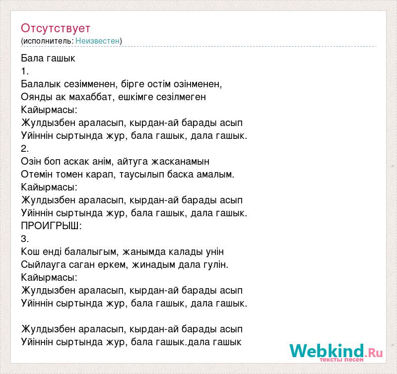 Бала гашык 1. Балалык сезімменен, бірге остім озінменен, Оянды ак махаббат, ешкімге сезілмеген Кайырмасы: Жулдызбен араласып, кырдан-ай барады асып Уйіннін сыртында жур, бала гашык, дала гашык. 2. Озін боп аскак анім, айтуга жасканамын Отемін томен карап, таусылып баска амалым. Кайырмасы: Жулдызбен араласып, кырдан-ай барады асып Уйіннін сыртында жур, бала гашык, дала гашык. ПРОИГРЫШ: 3. Кош енді балалыгым, жанымда калады унін Сыйлауга саган еркем, жинадым дала гулін. Кайырмасы: Жулдызбен араласып, кырдан-ай барады асып Уйіннін сыртында жур, бала гашык, дала гашык. Жулдызбен араласып, кырдан-ай барады асып Уйіннін сыртында жур, бала гашык.дала гашык