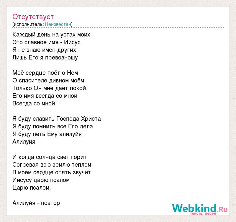 Каждый день на устах моих Это славное имя - Иисус Я не знаю имен других Лишь Его я превозношу Моё сердце поёт о Нем О спасителе дивном моём Только Он мне даёт покой Его имя всегда со мной Всегда со мной Я буду славить Господа Христа Я буду помнить все Его дела Я буду петь Ему алилуйя Алилуйя И когда солнца свет горит Согревая всю землю теплом В моём сердце опять звучит Иисусу царю псалом Царю псалом. Алилуйя - повтор