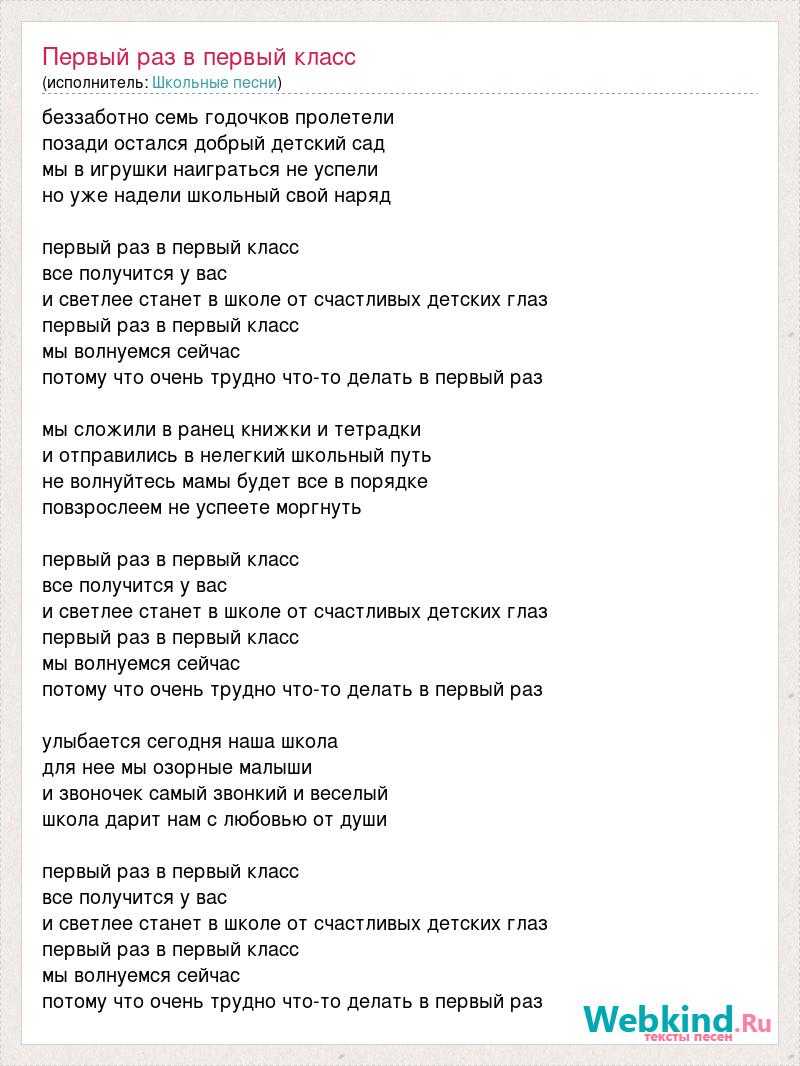 беззаботно семь годочков пролетели позади остался добрый детский сад мы в игрушки наиграться не успели но уже надели школьный свой наряд первый раз в первый класс все получится у вас и светлее станет в школе от счастливых детских глаз первый раз в первый класс мы волнуемся сейчас потому что очень трудно что-то делать в первый раз мы сложили в ранец книжки и тетрадки и отправились в нелегкий школьный путь не волнуйтесь мамы будет все в порядке повзрослеем не успеете моргнуть первый раз в первый класс все получится у вас и светлее станет в школе от счастливых детских глаз первый раз в первый класс мы волнуемся сейчас потому что очень трудно что-то делать в первый раз улыбается сегодня наша школа для нее мы озорные малыши и звоночек самый звонкий и веселый школа дарит нам с любовью от души первый раз в первый класс все получится у вас и светлее станет в школе от счастливых детских глаз первый раз в первый класс мы волнуемся сейчас потому что очень трудно что-то делать в первый раз