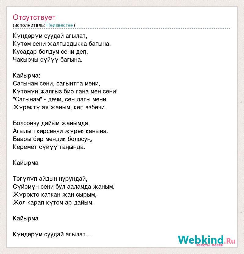 Күндөрүм суудай агылат, Күтөм сени жалгыздыкка багына. Кусадар болдум сени деп, Чакырчы сүйүү багына. Кайырма: Сагынам сени, сагынтпа мени, Күтөмүн жалгыз бир гана мен сени! "Сагынам" - дечи, сен дагы мени, Жүрөктү ая жаным, көп эзбечи. Болсоңчу дайым жанымда, Агылып кирсеңчи жүрөк канына. Баары бир мендик болосуң, Керемет сүйүү таңында. Кайырма Төгүлүп айдын нурундай, Сүйөмүн сени бул ааламда жаным. Жүрөктө каткан жан сырым, Жол карап күтөм ар дайым. Кайырма Күндөрүм суудай агылат...