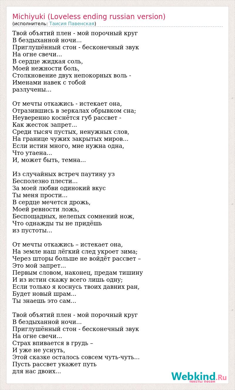 Твой объятий плен - мой порочный круг В бездыханной ночи... Приглушённый стон - бесконечный звук На огне свечи... В сердце жидкая соль, Моей нежности боль, Столкновение двух непокорных воль - Именами навек с тобой разлучены... От мечты откажись - истекает она, Отразившись в зеркалах обрывком сна; Неуверенно коснётся губ рассвет - Как жесток запрет... Среди тысяч пустых, ненужных слов, На границе чужих закрытых миров... Если истин много, мне нужна одна, Что утаена... И, может быть, темна... Из случайных встреч паутину уз Бесполезно плести... За моей любви одинокий вкус Ты меня прости... В сердце мечется дрожь, Моей ревности ложь, Беспощадных, нелепых сомнений нож, Что однажды ты не придёшь из пустоты... От мечты откажись – истекает она, На земле наш лёгкий след укроет зима; Через шторы больше не войдёт рассвет – Это мой запрет... Первым словом, наконец, предам тишину И из истин скажу всего лишь одну; Если только я коснусь твоих давних ран, Будет новый шрам... Ты знаешь это сам... Твой объятий плен - мой порочный круг В бездыханной ночи... Приглушённый стон - бесконечный звук На огне свечи... Страх впивается в грудь – И уже не уснуть, Этой сказке осталось совсем чуть-чуть... Пусть рассвет укажет путь для нас двоих...