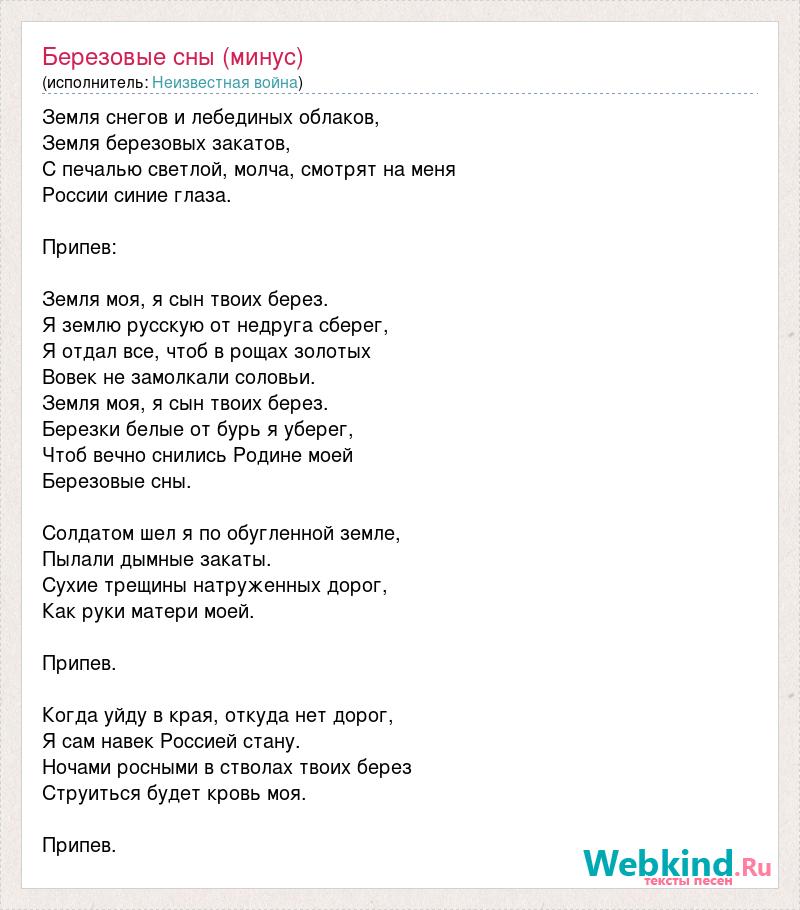 Земля снегов и лебединых облаков, Земля березовых закатов, С печалью светлой, молча, смотрят на меня России синие глаза. Припев: Земля моя, я сын твоих берез. Я землю русскую от недруга сберег, Я отдал все, чтоб в рощах золотых Вовек не замолкали соловьи. Земля моя, я сын твоих берез. Березки белые от бурь я уберег, Чтоб вечно снились Родине моей Березовые сны. Солдатом шел я по обугленной земле, Пылали дымные закаты. Сухие трещины натруженных дорог, Как руки матери моей. Припев. Когда уйду в края, откуда нет дорог, Я сам навек Россией стану. Ночами росными в стволах твоих берез Струиться будет кровь моя. Припев.