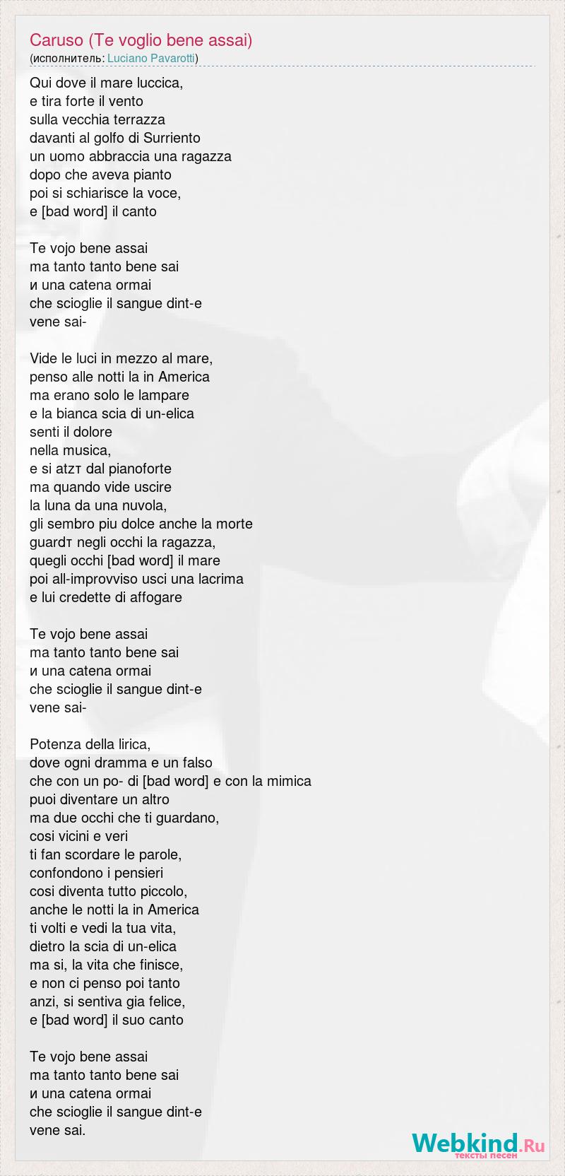 Qui dove il mare luccica, e tira forte il vento sulla vecchia terrazza davanti al golfo di Surriento un uomo abbraccia una ragazza dopo che aveva pianto poi si schiarisce la voce, e [bad word] il canto Te vojo bene assai ma tanto tanto bene sai и una catena ormai che scioglie il sangue dint-e vene sai- Vide le luci in mezzo al mare, penso alle notti lа in America ma erano solo le lampare e la bianca scia di un-elica senti il dolore nella musica, e si atzт dal pianoforte ma quando vide uscire la luna da una nuvola, gli sembro piu dolce anche la morte guardт negli occhi la ragazza, quegli occhi [bad word] il mare poi all-improvviso usci una lacrima e lui credette di affogare Te vojo bene assai ma tanto tanto bene sai и una catena ormai che scioglie il sangue dint-e vene sai- Potenza della lirica, dove ogni dramma e un falso che con un po- di [bad word] e con la mimica puoi diventare un altro ma due occhi che ti guardano, cosi vicini e veri ti fan scordare le parole, confondono i pensieri cosi diventa tutto piccolo, anche le notti lа in America ti volti e vedi la tua vita, dietro la scia di un-elica ma si, la vita che finisce, e non ci penso poi tanto anzi, si sentiva giа felice, e [bad word] il suo canto Te vojo bene assai ma tanto tanto bene sai и una catena ormai che scioglie il sangue dint-e vene sai.