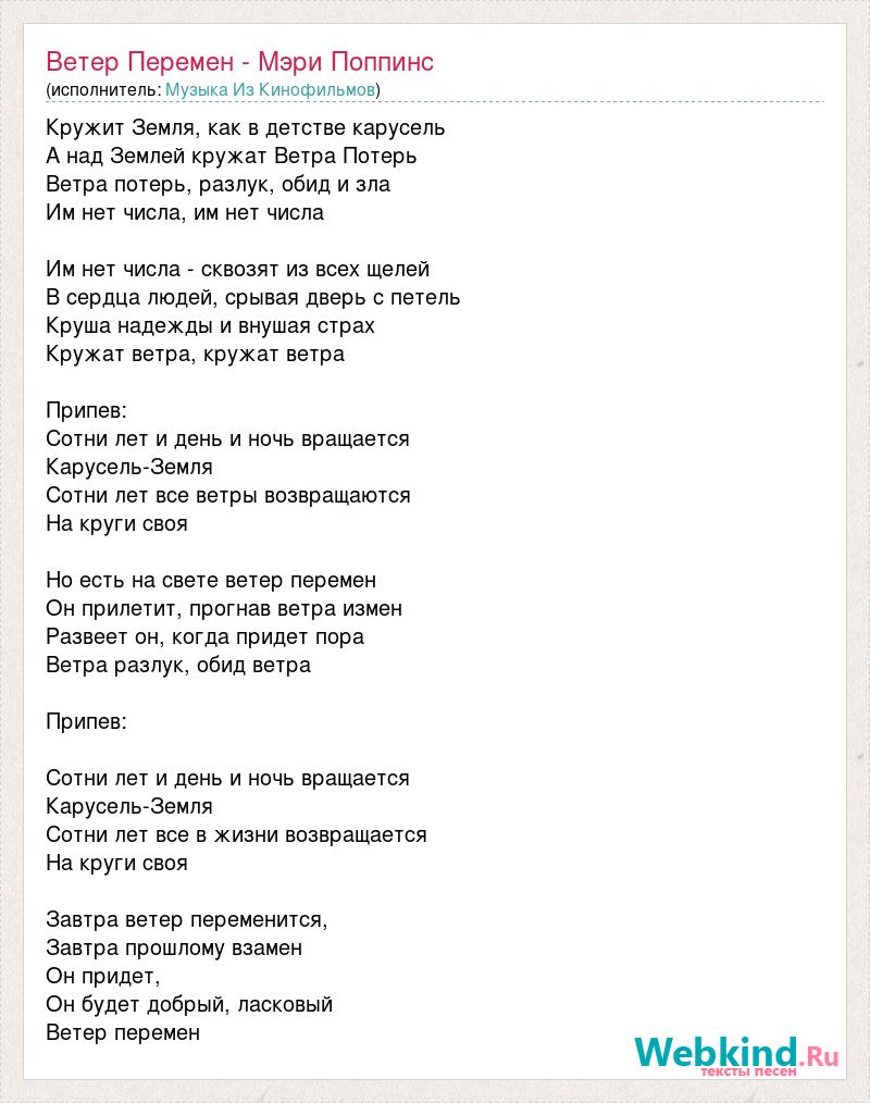 Кружит Земля, как в детстве карусель А над Землей кружат Ветра Потерь Ветра потерь, разлук, обид и зла Им нет числа, им нет числа Им нет числа - сквозят из всех щелей В сердца людей, срывая дверь с петель Круша надежды и внушая страх Кружат ветра, кружат ветра Припев: Сотни лет и день и ночь вращается Карусель-Земля Сотни лет все ветры возвращаются Hа круги своя Hо есть на свете ветер перемен Он прилетит, прогнав ветра измен Развеет он, когда придет пора Ветра разлук, обид ветра Припев: Сотни лет и день и ночь вращается Карусель-Земля Сотни лет все в жизни возвращается Hа круги своя Завтра ветер переменится, Завтра прошлому взамен Он придет, Он будет добрый, ласковый Ветер перемен