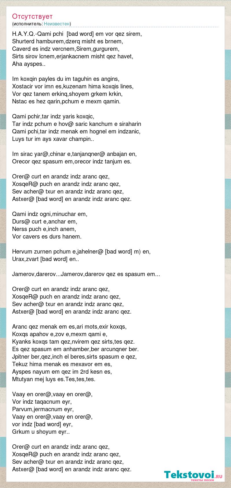 H.A.Y.Q.-Qami pchi Aprum em vor qez sirem, Shurterd hamburem,dzerq misht es brnem, Caverd es indz vercnem,Sirem,gurgurem, Sirts sirov lcnem,erjankacnem misht qez havet, Aha ayspes.. Im koxqin payles du im taguhin es angins, Xostacir vor imn es,kuzenam hima koxqis lines, Vor qez tanem erkinq,shoyem grkem krkin, Nstac es hez qarin,pchum e mexm qamin. Qami pchir,tar indz yaris koxqic, Tar indz pchum e hov@ saric kanchum e siraharin Qami pchi,tar indz menak em hognel em indzanic, Luys tur im ays xavar champin.. Im sirac yar@,chinar e,tanjanqner@ anbajan en, Orecor qez spasum em,orecor indz tanjum es. Orer@ curt en arandz indz aranc qez, XosqeR@ puch en arandz indz aranc qez, Sev acher@ txur en arandz indz aranc qez, Astxer@ marum en arandz indz aranc qez. Qami indz ogni,minuchar em, Durs@ curt e,anchar em, Nerss puch e,inch anem, Vor cavers es durs hanem. Hervum zurnen pchum e,jahelner@ sirun(m) en, Urax,zvart barbarum en.. Jamerov,darerov...Jamerov,darerov qez es spasum em... Orer@ curt en arandz indz aranc qez, XosqeR@ puch en arandz indz aranc qez, Sev acher@ txur en arandz indz aranc qez, Astxer@ marum en arandz indz aranc qez. Aranc qez menak em es,ari mots,exir koxqs, Koxqs apahov e,zov e,mexm qami e, Kyanks koxqs tam qez,nvirem qez sirts,tes qez. Es qez spasum em anhamber,ber arcunqner ber. Jpitner ber,qez,inch el beres,sirts spasum e qez, Tekuz hima menak es mexavor em es, Ayspes nayum em qez im 2rd kesn es, Mtutyan mej luys es.Tes,tes,tes. Vaay en orer@,vaay en orer@, Vor indz taqacnum eyr, Parvum,jermacnum eyr, Vaay en orer@,vaay en orer@, vor indz hamburum eyr, Grkum u shoyum eyr.. Orer@ curt en arandz indz aranc qez, XosqeR@ puch en arandz indz aranc qez, Sev acher@ txur en arandz indz aranc qez, Astxer@ marum en arandz indz aranc qez.