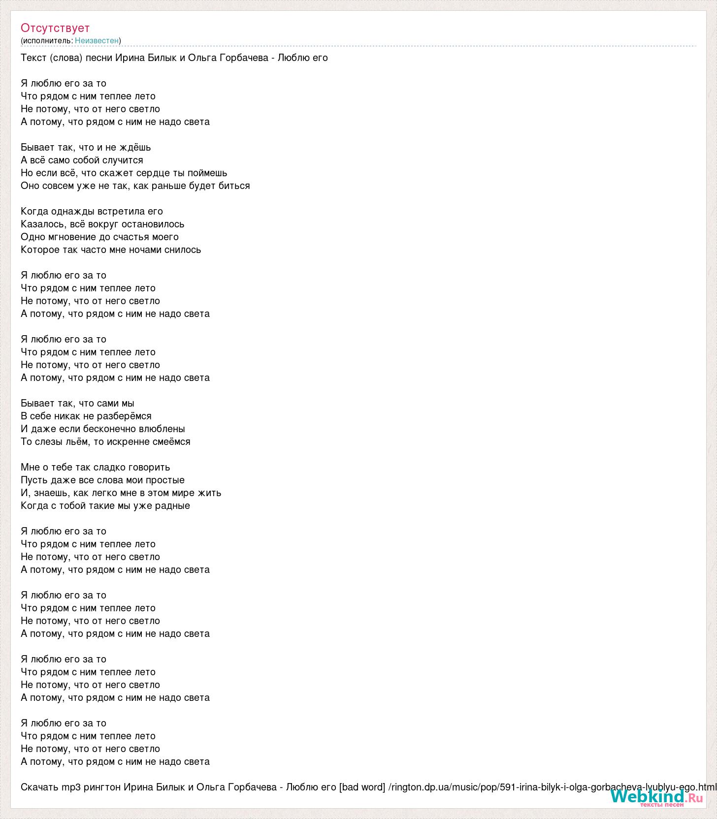 Текст (слова) песни Ирина Билык и Ольга Горбачева - Люблю его