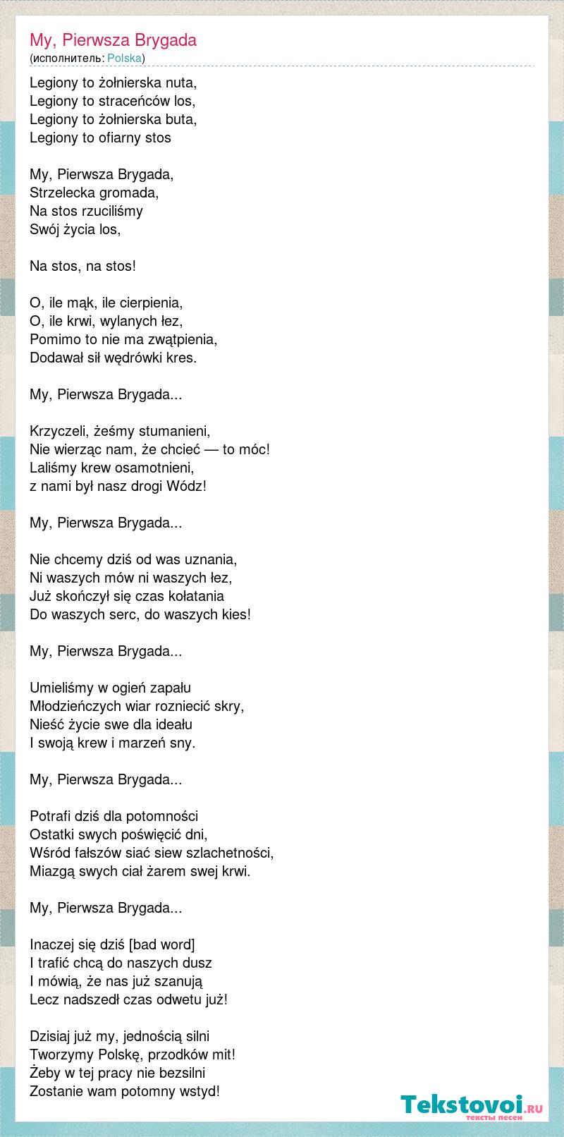 Legiony to żołnierska nuta, Legiony to straceńców los, Legiony to żołnierska buta, Legiony to ofiarny stos My, Pierwsza Brygada, Strzelecka gromada, Na stos rzuciliśmy Swój życia los, Na stos, na stos! O, ile mąk, ile cierpienia, O, ile krwi, wylanych łez, Pomimo to nie ma zwątpienia, Dodawał sił wędrówki kres. My, Pierwsza Brygada... Krzyczeli, żeśmy stumanieni, Nie wierząc nam, że chcieć — to móc! Laliśmy krew osamotnieni, z nami był nasz drogi Wódz! My, Pierwsza Brygada... Nie chcemy dziś od was uznania, Ni waszych mów ni waszych łez, Już skończył się czas kołatania Do waszych serc, do waszych kies! My, Pierwsza Brygada... Umieliśmy w ogień zapału Młodzieńczych wiar rozniecić skry, Nieść życie swe dla ideału I swoją krew i marzeń sny. My, Pierwsza Brygada... Potrafi dziś dla potomności Ostatki swych poświęcić dni, Wśród fałszów siać siew szlachetności, Miazgą swych ciał żarem swej krwi. My, Pierwsza Brygada... Inaczej się dziś zapatrują I trafić chcą do naszych dusz I mówią, że nas już szanują Lecz nadszedł czas odwetu już! Dzisiaj już my, jednością silni Tworzymy Polskę, przodków mit! Żeby w tej pracy nie bezsilni Zostanie wam potomny wstyd!