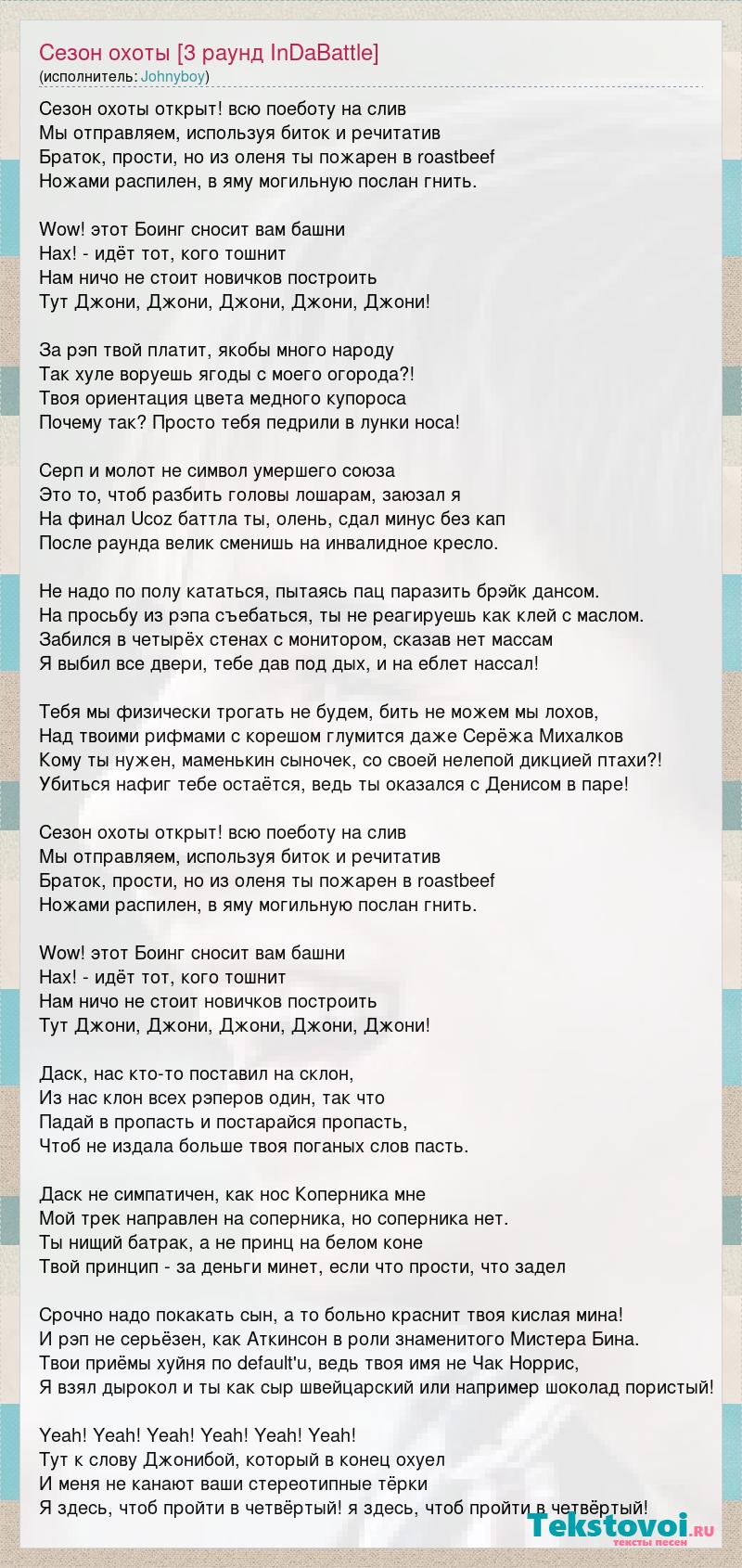 Сезон охоты открыт! всю поеботу на слив Мы отправляем, используя биток и речитатив Браток, прости, но из оленя ты пожарен в roastbeef Ножами распилен, в яму могильную послан гнить. Wow! этот Боинг сносит вам башни Нах! - идёт тот, кого тошнит Нам ничо не стоит новичков построить Тут Джони, Джони, Джони, Джони, Джони! За рэп твой платит, якобы много народу Так хуле воруешь ягоды с моего огорода?! Твоя ориентация цвета медного купороса Почему так? Просто тебя педрили в лунки носа! Серп и молот не символ умершего союза Это то, чтоб разбить головы лошарам, заюзал я На финал Ucoz баттла ты, олень, сдал минус без кап После раунда велик сменишь на инвалидное кресло. Не надо по полу кататься, пытаясь пац паразить брэйк дансом. На просьбу из рэпа съебаться, ты не реагируешь как клей с маслом. Забился в четырёх стенах с монитором, сказав нет массам Я выбил все двери, тебе дав под дых, и на еблет нассал! Тебя мы физически трогать не будем, бить не можем мы лохов, Над твоими рифмами с корешом глумится даже Серёжа Михалков Кому ты нужен, маменькин сыночек, со своей нелепой дикцией птахи?! Убиться нафиг тебе остаётся, ведь ты оказался с Денисом в паре! Сезон охоты открыт! всю поеботу на слив Мы отправляем, используя биток и речитатив Браток, прости, но из оленя ты пожарен в roastbeef Ножами распилен, в яму могильную послан гнить. Wow! этот Боинг сносит вам башни Нах! - идёт тот, кого тошнит Нам ничо не стоит новичков построить Тут Джони, Джони, Джони, Джони, Джони! Даск, нас кто-то поставил на склон, Из нас клон всех рэперов один, так что Падай в пропасть и постарайся пропасть, Чтоб не издала больше твоя поганых слов пасть. Даск не симпатичен, как нос Коперника мне Мой трек направлен на соперника, но соперника нет. Ты нищий батрак, а не принц на белом коне Твой принцип - за деньги минет, если что прости, что задел Срочно надо покакать сын, а то больно краснит твоя кислая мина! И рэп не серьёзен, как Аткинсон в роли знаменитого Мистера Бина. Твои приёмы хуйня по default'u, ведь твоя имя не Чак Норрис, Я взял дырокол и ты как сыр швейцарский или например шоколад пористый! Yeah! Yeah! Yeah! Yeah! Yeah! Yeah! Тут к слову Джонибой, который в конец охуел И меня не канают ваши стереотипные тёрки Я здесь, чтоб пройти в четвёртый! я здесь, чтоб пройти в четвёртый!