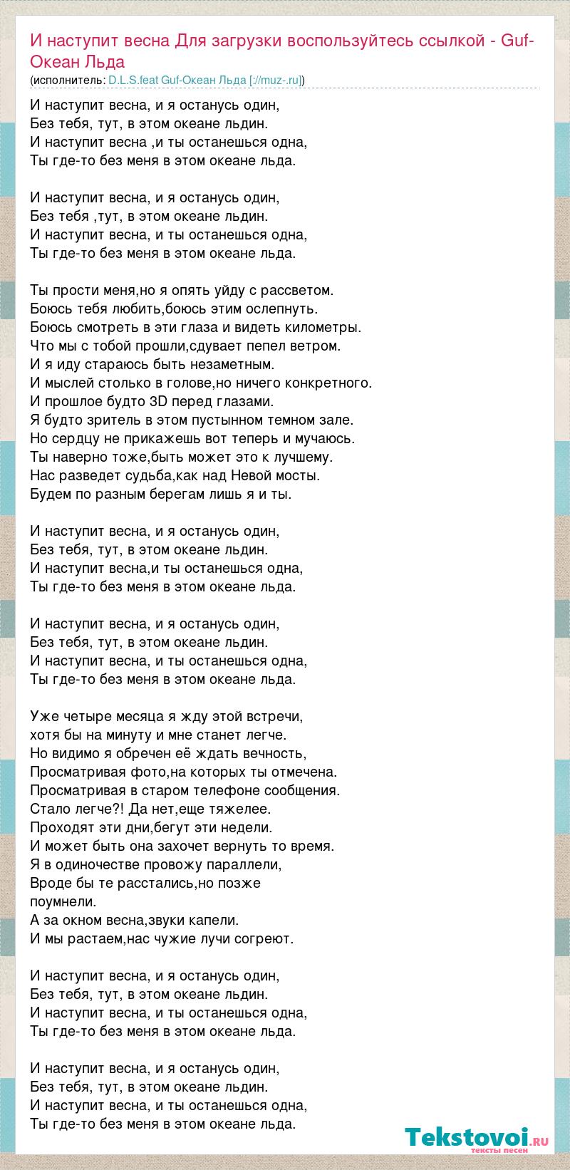 И наступит весна, и я останусь один, Без тебя, тут, в этом океане льдин. И наступит весна ,и ты останешься одна, Ты где-то без меня в этом океане льда. И наступит весна, и я останусь один, Без тебя ,тут, в этом океане льдин. И наступит весна, и ты останешься одна, Ты где-то без меня в этом океане льда. Ты прости меня,но я опять уйду с рассветом. Боюсь тебя любить,боюсь этим ослепнуть. Боюсь смотреть в эти глаза и видеть километры. Что мы с тобой прошли,сдувает пепел ветром. И я иду стараюсь быть незаметным. И мыслей столько в голове,но ничего конкретного. И прошлое будто 3D перед глазами. Я будто зритель в этом пустынном темном зале. Но сердцу не прикажешь вот теперь и мучаюсь. Ты наверно тоже,быть может это к лучшему. Нас разведет судьба,как над Невой мосты. Будем по разным берегам лишь я и ты. И наступит весна, и я останусь один, Без тебя, тут, в этом океане льдин. И наступит весна,и ты останешься одна, Ты где-то без меня в этом океане льда. И наступит весна, и я останусь один, Без тебя, тут, в этом океане льдин. И наступит весна, и ты останешься одна, Ты где-то без меня в этом океане льда. Уже четыре месяца я жду этой встречи, хотя бы на минуту и мне станет легче. Но видимо я обречен её ждать вечность, Просматривая фото,на которых ты отмечена. Просматривая в старом телефоне сообщения. Стало легче?! Да нет,еще тяжелее. Проходят эти дни,бегут эти недели. И может быть она захочет вернуть то время. Я в одиночестве провожу параллели, Вроде бы те расстались,но позже поумнели. А за окном весна,звуки капели. И мы растаем,нас чужие лучи согреют. И наступит весна, и я останусь один, Без тебя, тут, в этом океане льдин. И наступит весна, и ты останешься одна, Ты где-то без меня в этом океане льда. И наступит весна, и я останусь один, Без тебя, тут, в этом океане льдин. И наступит весна, и ты останешься одна, Ты где-то без меня в этом океане льда.