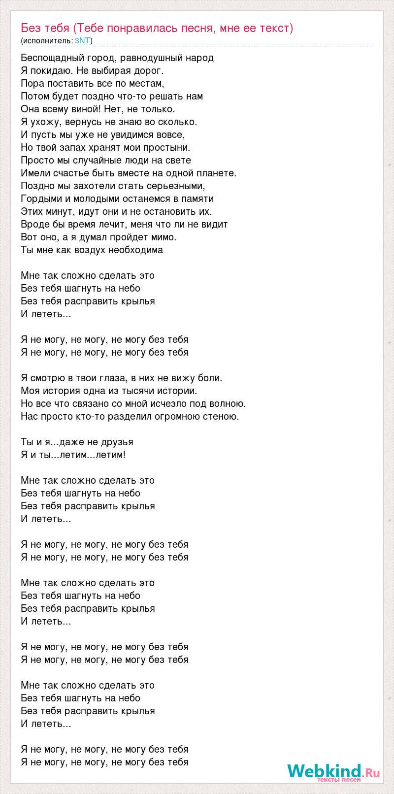 Беспощадный город, равнодушный народ Я покидаю. Не выбирая дорог. Пора поставить все по местам, Потом будет поздно что-то решать нам Она всему виной! Нет, не только. Я ухожу, вернусь не знаю во сколько. И пусть мы уже не увидимся вовсе, Но твой запах хранят мои простыни. Просто мы случайные люди на свете Имели счастье быть вместе на одной планете. Поздно мы захотели стать серьезными, Гордыми и молодыми останемся в памяти Этих минут, идут они и не остановить их. Вроде бы время лечит, меня что ли не видит Вот оно, а я думал пройдет мимо. Ты мне как воздух необходима Мне так сложно сделать это Без тебя шагнуть на небо Без тебя расправить крылья И лететь... Я не могу, не могу, не могу без тебя Я не могу, не могу, не могу без тебя Я смотрю в твои глаза, в них не вижу боли. Моя история одна из тысячи истории. Но все что связано со мной исчезло под волною. Нас просто кто-то разделил огромною стеною. Ты и я...даже не друзья Я и ты...летим...летим! Мне так сложно сделать это Без тебя шагнуть на небо Без тебя расправить крылья И лететь... Я не могу, не могу, не могу без тебя Я не могу, не могу, не могу без тебя Мне так сложно сделать это Без тебя шагнуть на небо Без тебя расправить крылья И лететь... Я не могу, не могу, не могу без тебя Я не могу, не могу, не могу без тебя Мне так сложно сделать это Без тебя шагнуть на небо Без тебя расправить крылья И лететь... Я не могу, не могу, не могу без тебя Я не могу, не могу, не могу без тебя