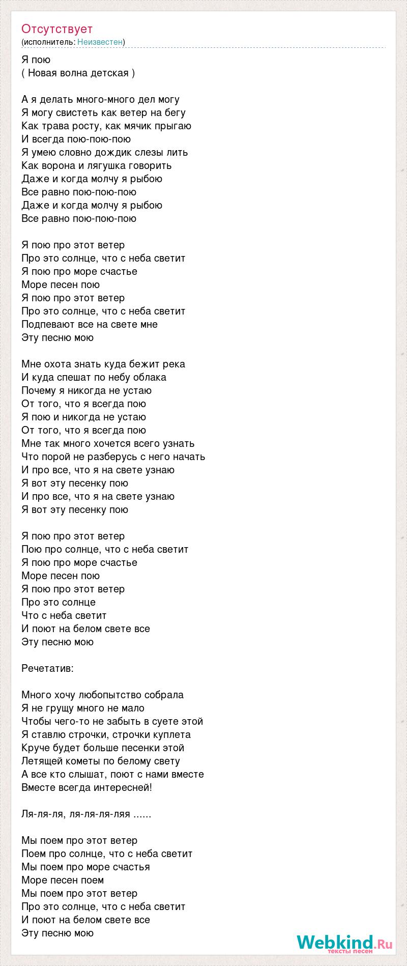 Я пою ( Новая волна детская ) А я делать много-много дел могу Я могу свистеть как ветер на бегу Как трава росту, как мячик прыгаю И всегда пою-пою-пою Я умею словно дождик слезы лить Как ворона и лягушка говорить Даже и когда молчу я рыбою Все равно пою-пою-пою Даже и когда молчу я рыбою Все равно пою-пою-пою Я пою про этот ветер Про это солнце, что с неба светит Я пою про море счастье Море песен пою Я пою про этот ветер Про это солнце, что с неба светит Подпевают все на свете мне Эту песню мою Мне охота знать куда бежит река И куда спешат по небу облака Почему я никогда не устаю От того, что я всегда пою Я пою и никогда не устаю От того, что я всегда пою Мне так много хочется всего узнать Что порой не разберусь с него начать И про все, что я на свете узнаю Я вот эту песенку пою И про все, что я на свете узнаю Я вот эту песенку пою Я пою про этот ветер Пою про солнце, что с неба светит Я пою про море счастье Море песен пою Я пою про этот ветер Про это солнце Что с неба светит И поют на белом свете все Эту песню мою Речетатив: Много хочу любопытство собрала Я не грущу много не мало Чтобы чего-то не забыть в суете этой Я ставлю строчки, строчки куплета Круче будет больше песенки этой Летящей кометы по белому свету А все кто слышат, поют с нами вместе Вместе всегда интересней! Ля-ля-ля, ля-ля-ля-ляя ...... Мы поем про этот ветер Поем про солнце, что с неба светит Мы поем про море счастья Море песен поем Мы поем про этот ветер Про это солнце, что с неба светит И поют на белом свете все Эту песню мою