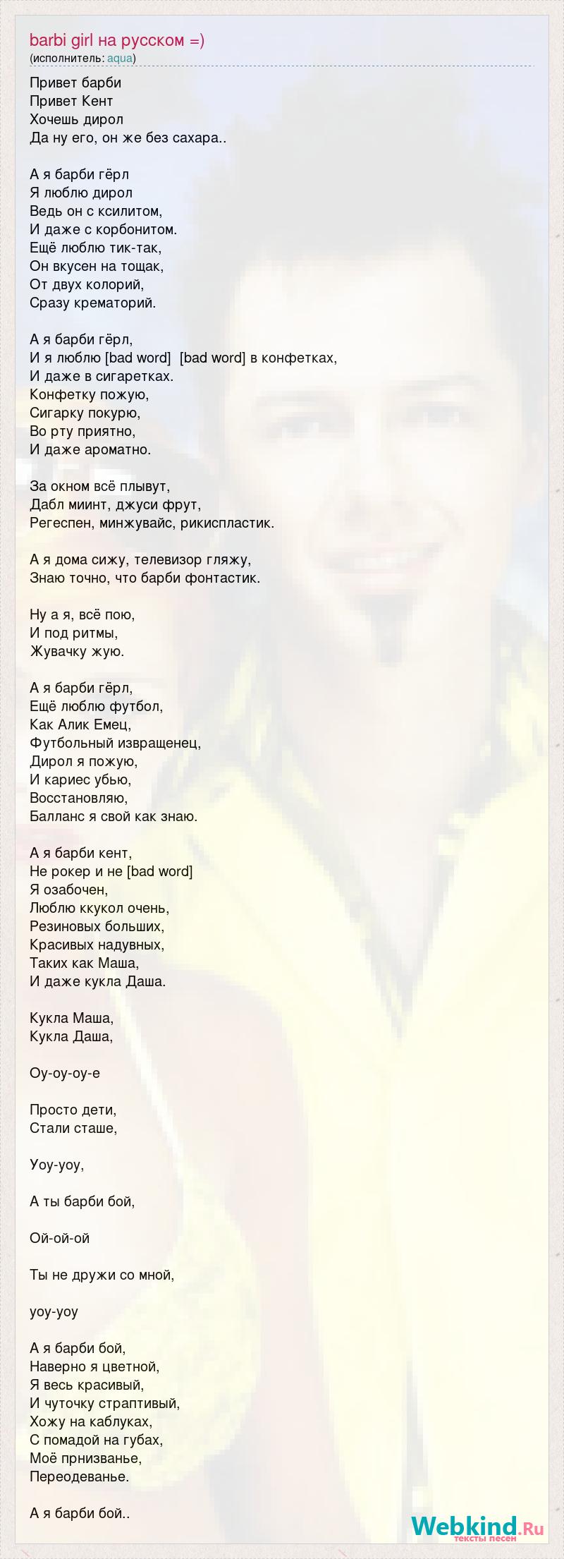 Привет барби Привет Кент Хочешь дирол Да ну его, он же без сахара.. А я барби гёрл Я люблю дирол Ведь он с ксилитом, И даже с корбонитом. Ещё люблю тик-так, Он вкусен на тощак, От двух колорий, Сразу крематорий. А я барби гёрл, И я люблю [bad word] [bad word] в конфетках, И даже в сигаретках. Конфетку пожую, Сигарку покурю, Во рту приятно, И даже ароматно. За окном всё плывут, Дабл миинт, джуси фрут, Регеспен, минжувайс, рикиспластик. А я дома сижу, телевизор гляжу, Знаю точно, что барби фонтастик. Ну а я, всё пою, И под ритмы, Жувачку жую. А я барби гёрл, Ещё люблю футбол, Как Алик Емец, Футбольный извращенец, Дирол я пожую, И кариес убью, Восстановляю, Балланс я свой как знаю. А я барби кент, Не рокер и не [bad word] Я озабочен, Люблю ккукол очень, Резиновых больших, Красивых надувных, Таких как Маша, И даже кукла Даша. Кукла Маша, Кукла Даша, Оу-оу-оу-е Просто дети, Стали сташе, Уоу-уоу, А ты барби бой, Ой-ой-ой Ты не дружи со мной, уоу-уоу А я барби бой, Наверно я цветной, Я весь красивый, И чуточку страптивый, Хожу на каблуках, С помадой на губах, Моё прнизванье, Переодеванье. А я барби бой..