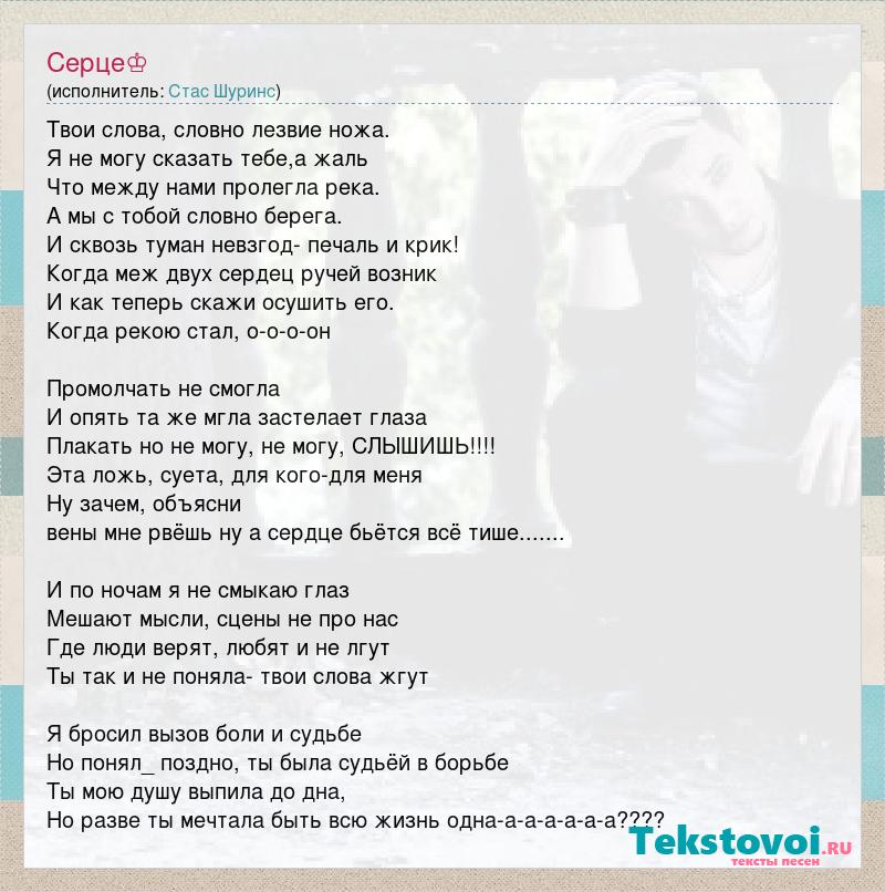 Твои слова, словно лезвие ножа. Я не могу сказать тебе,а жаль Что между нами пролегла река. А мы с тобой словно берега. И сквозь туман невзгод- печаль и крик! Когда меж двух сердец ручей возник И как теперь скажи осушить его. Когда рекою стал, о-о-о-он Промолчать не смогла И опять та же мгла застелает глаза Плакать но не могу, не могу, СЛЫШИШЬ!!!! Эта ложь, суета, для кого-для меня Ну зачем, объясни вены мне рвёшь ну а сердце бьётся всё тише....... И по ночам я не смыкаю глаз Мешают мысли, сцены не про нас Где люди верят, любят и не лгут Ты так и не поняла- твои слова жгут Я бросил вызов боли и судьбе Но понял_ поздно, ты была судьёй в борьбе Ты мою душу выпила до дна, Но разве ты мечтала быть всю жизнь одна-а-а-а-а-а-а????
