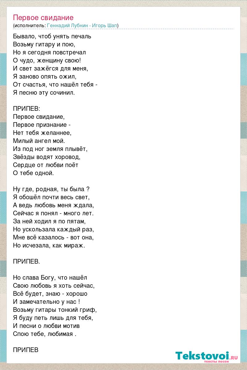 Бывало, чтоб унять печаль Возьму гитару и пою, Но я сегодня повстречал О чудо, женщину свою! И свет зажёгся для меня, Я заново опять ожил, От счастья, что нашёл тебя - Я песню эту сочинил. ПРИПЕВ: Первое свидание, Первое признание - Нет тебя желаннее, Милый ангел мой. Из под ног земля плывёт, Звёзды водят хоровод, Сердце от любви поёт О тебе одной. Ну где, родная, ты была ? Я обошёл почти весь свет, А ведь любовь меня ждала, Сейчас я понял - много лет. За ней ходил я по пятам, Но ускользала каждый раз, Мне всё казалось - вот она, Но исчезала, как мираж. ПРИПЕВ. Но слава Богу, что нашёл Свою любовь я хоть сейчас, Всё будет, знаю - хорошо И замечательно у нас ! Возьму гитары тонкий гриф, Я буду петь лишь для тебя, И песни о любви мотив Спою тебе, любимая . ПРИПЕВ