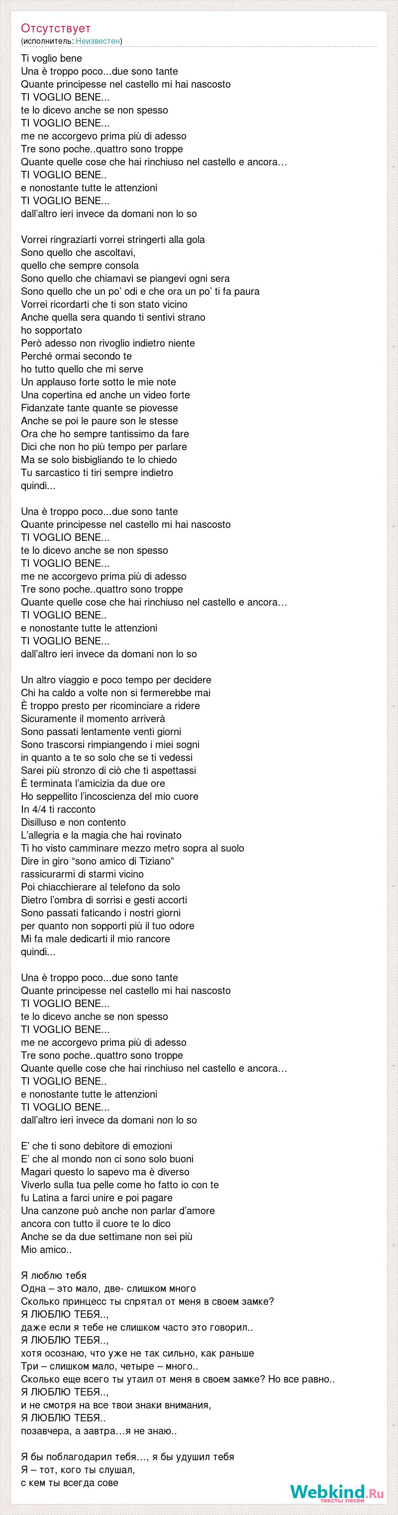 Ti voglio bene Una è troppo poco...due sono tante Quante principesse nel castello mi hai nascosto TI VOGLIO BENE... te lo dicevo anche se non spesso TI VOGLIO BENE... me ne accorgevo prima più di adesso Tre sono poche..quattro sono troppe Quante quelle cose che hai rinchiuso nel castello e ancora… TI VOGLIO BENE.. e nonostante tutte le attenzioni TI VOGLIO BENE... dall’altro ieri invece da domani non lo so Vorrei ringraziarti vorrei stringerti alla gola Sono quello che ascoltavi, quello che sempre consola Sono quello che chiamavi se piangevi ogni sera Sono quello che un po’ odi e che ora un po’ ti fa paura Vorrei ricordarti che ti son stato vicino Anche quella sera quando ti sentivi strano ho sopportato Però adesso non rivoglio indietro niente Perché ormai secondo te ho tutto quello che mi serve Un applauso forte sotto le mie note Una copertina ed anche un video forte Fidanzate tante quante se piovesse Anche se poi le paure son le stesse Ora che ho sempre tantissimo da fare Dici che non ho più tempo per parlare Ma se solo bisbigliando te lo chiedo Tu sarcastico ti tiri sempre indietro quindi... Una è troppo poco...due sono tante Quante principesse nel castello mi hai nascosto TI VOGLIO BENE... te lo dicevo anche se non spesso TI VOGLIO BENE... me ne accorgevo prima più di adesso Tre sono poche..quattro sono troppe Quante quelle cose che hai rinchiuso nel castello e ancora… TI VOGLIO BENE.. e nonostante tutte le attenzioni TI VOGLIO BENE... dall’altro ieri invece da domani non lo so Un altro viaggio e poco tempo per decidere Chi ha caldo a volte non si fermerebbe mai È troppo presto per ricominciare a ridere Sicuramente il momento arriverà Sono passati lentamente venti giorni Sono trascorsi rimpiangendo i miei sogni in quanto a te so solo che se ti vedessi Sarei più stronzo di ciò che ti aspettassi È terminata l’amicizia da due ore Ho seppellito l’incoscienza del mio cuore In 4/4 ti racconto Disilluso e non contento L’allegria e la magia che hai rovinato Ti ho visto camminare mezzo metro sopra al suolo Dire in giro “sono amico di Tiziano” rassicurarmi di starmi vicino Poi chiacchierare al telefono da solo Dietro l’ombra di sorrisi e gesti accorti Sono passati faticando i nostri giorni per quanto non sopporti più il tuo odore Mi fa male dedicarti il mio rancore quindi... Una è troppo poco...due sono tante Quante principesse nel castello mi hai nascosto TI VOGLIO BENE... te lo dicevo anche se non spesso TI VOGLIO BENE... me ne accorgevo prima più di adesso Tre sono poche..quattro sono troppe Quante quelle cose che hai rinchiuso nel castello e ancora… TI VOGLIO BENE.. e nonostante tutte le attenzioni TI VOGLIO BENE... dall’altro ieri invece da domani non lo so E’ che ti sono debitore di emozioni E’ che al mondo non ci sono solo buoni Magari questo lo sapevo ma è diverso Viverlo sulla tua pelle come ho fatto io con te fu Latina a farci unire e poi pagare Una canzone può anche non parlar d’amore ancora con tutto il cuore te lo dico Anche se da due settimane non sei più Mio amico.. Я люблю тебя Одна – это мало, две- слишком много Сколько принцесс ты спрятал от меня в своем замке? Я ЛЮБЛЮ ТЕБЯ.., даже если я тебе не слишком часто это говорил.. Я ЛЮБЛЮ ТЕБЯ.., хотя осознаю, что уже не так сильно, как раньше Три – слишком мало, четыре – много.. Сколько еще всего ты утаил от меня в своем замке? Но все равно.. Я ЛЮБЛЮ ТЕБЯ.., и не смотря на все твои знаки внимания, Я ЛЮБЛЮ ТЕБЯ.. позавчера, а завтра…я не знаю.. Я бы поблагодарил тебя…, я бы удушил тебя Я – тот, кого ты слушал, с кем ты всегда сове